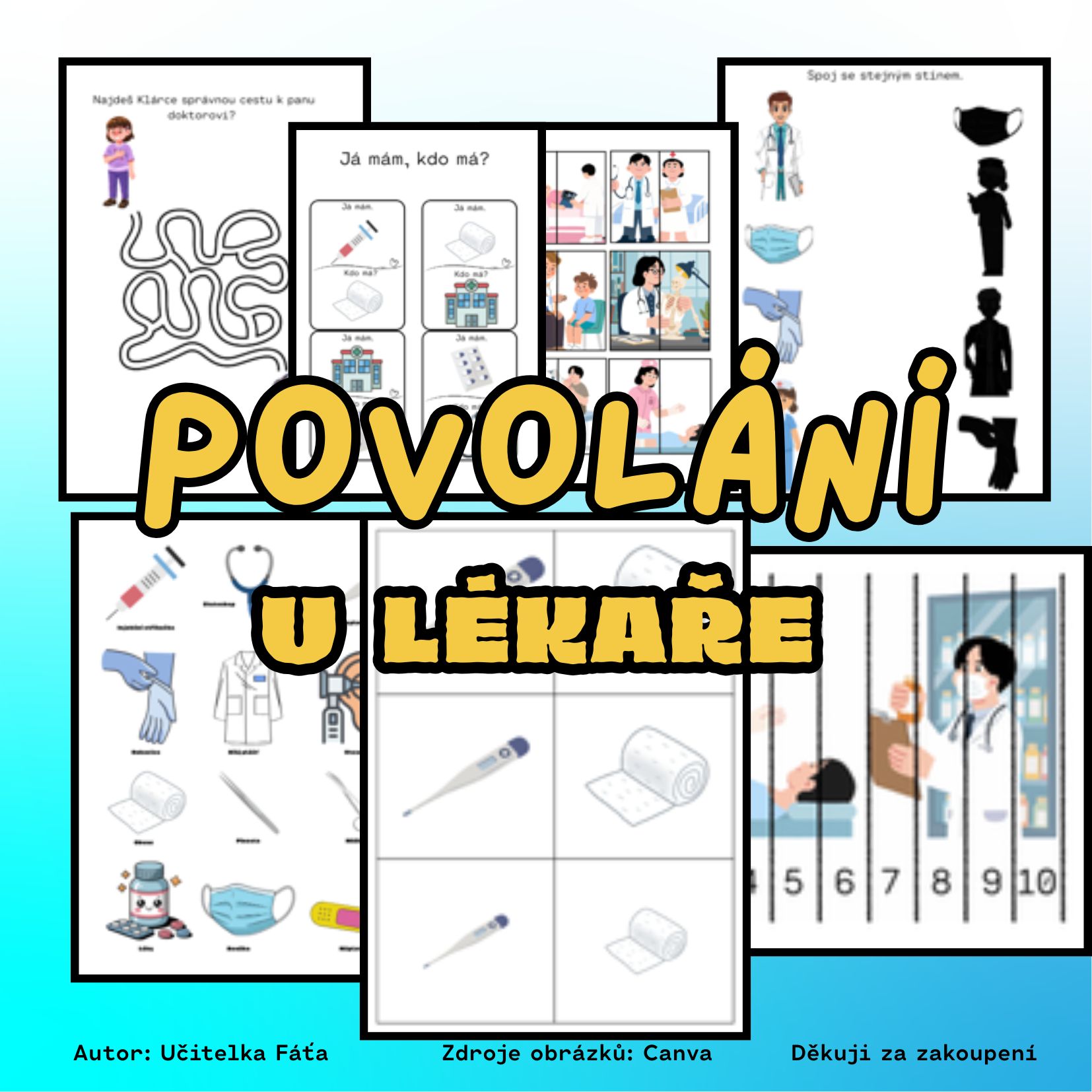 CHARAKTERISTIKA: Komplexní soubor 25 stran aktivit, který hravou formou zbavuje děti strachu z lékařů. Materiál kombinuje vizuální pomůcky (demonstrační karty) s pestrou škálou úkolů pro rozvoj logiky, grafomotoriky a předmatematických dovedností.