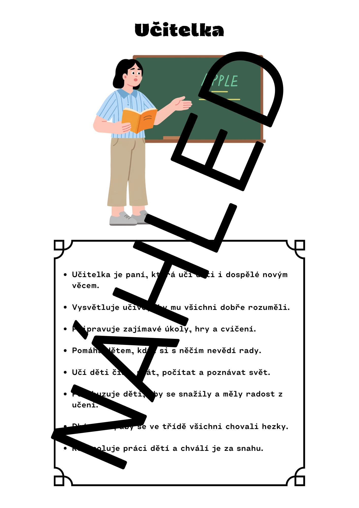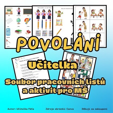 Soubor k tématu „povolání – učitelka“ obsahuje pestrou sadu didaktických materiálů pro děti v MŠ. Najdete zde 1 demonstrační kartu a 1 stranu se slovní zásobou, dále 2 strany otázek do komunikativního kruhu. Součástí je 7 pracovních listů (zakroužkuj, co do řady nepatří; počítání; spoj stín; bludiště ve dvou obtížnostech; vybarvi, co potřebuje paní učitelka). Materiál doplňuje 6 obrázků na hledání druhé poloviny, 3 obrázky na řazení podle velikosti (3 úrovně), 12 obrázků na tečkování hlásek, 12 kartiček ke hře „Já mám, kdo má?“ a 3 tematické omalovánky. Soubor rozvíjí slovní zásobu, logické myšlení, zrakové vnímání, grafomotoriku i komunikační dovednosti.