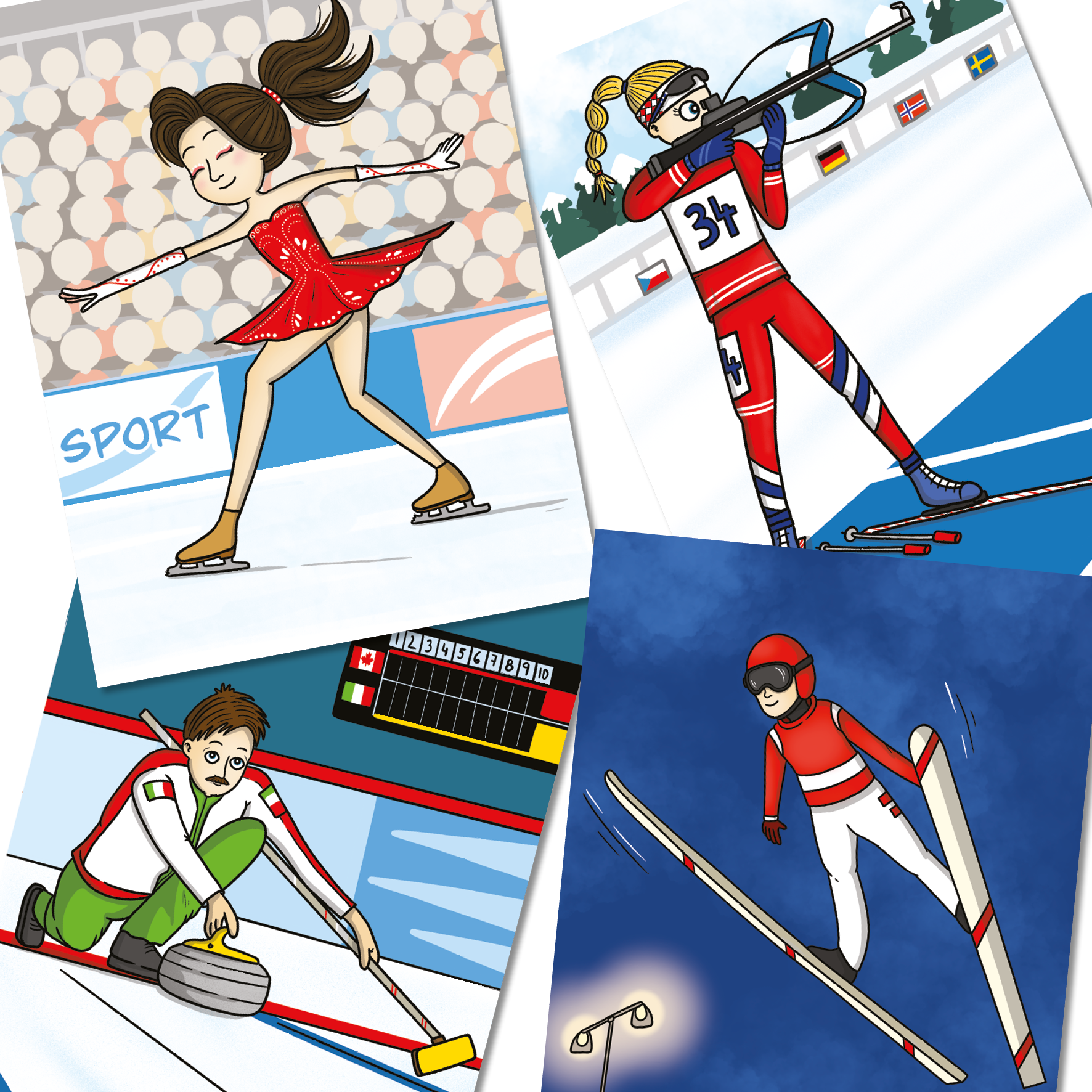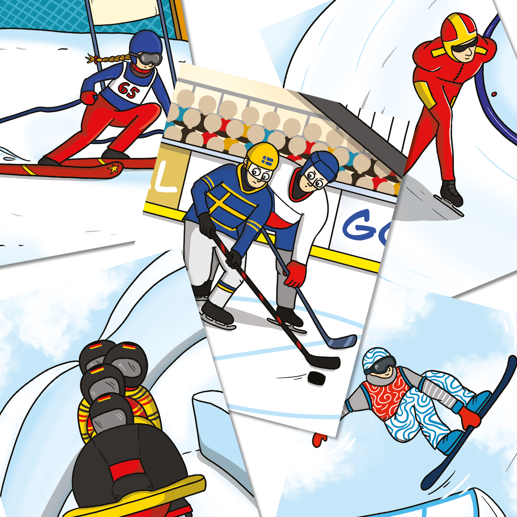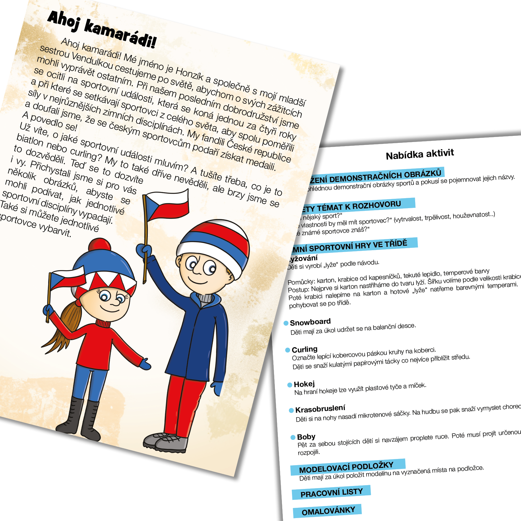 Mé jméno je Honzík a společně s mojí mladší sestrou Vendulkou cestujeme po světě, abychom o svých zážitcích mohli vyprávět ostatním. Při našem posledním dobrodružství jsme se ocitli na sportovní události, která se koná jednou za čtyři roky a při které se setkávají sportovci z celého světa, aby spolu poměřili síly v nejrůznějších zimních disciplínách. My fandili České republice a doufali jsme, že se českým sportovcům podaří získat medaili. A povedlo se! Už víte, o jaké sportovní události mluvím? A tušíte třeba, co je to biatlon nebo curling? My to také dříve nevěděli, ale brzy jsme se to dozvěděli. Teď se to dozvíte i vy. Přichystali jsme si pro vás několik obrázků, abyste se mohli podívat, jak jednotlivé sportovní disciplíny vypadají. Také si můžete jednotlivé sportovce vybarvit"