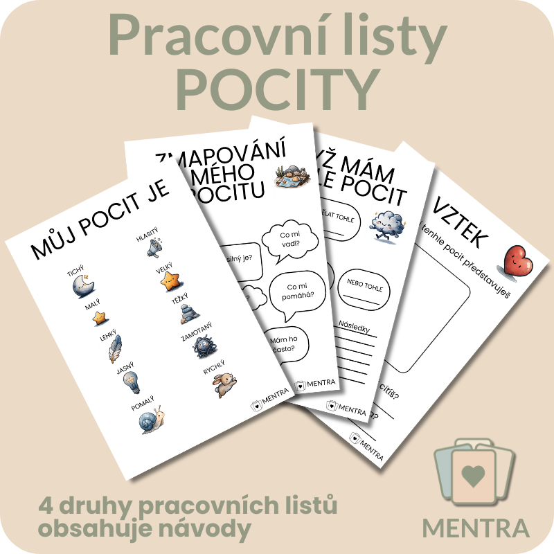 Tyto pracovní listy podporují děti v pojmenování pocitů, jejich uvědomění a bezpečném zkoumání toho, co právě prožívají. Děti kreslí, kde pocit cítí v těle, kdy ho zažily a jak si ho představují. Součástí jsou také aktivity zaměřené na vnímání intenzity pocitu, jeho proměnlivosti a hledání různých způsobů reakce v náročných i příjemných situacích. Materiál vede dítě k sebepoznání bez hodnocení nebo tlaku na správnou odpověď.