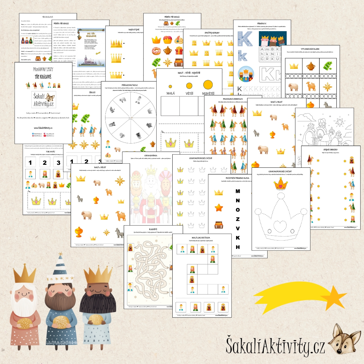 Pracovní listy s tematikou a motivem Tří králů, korun a královských darů.