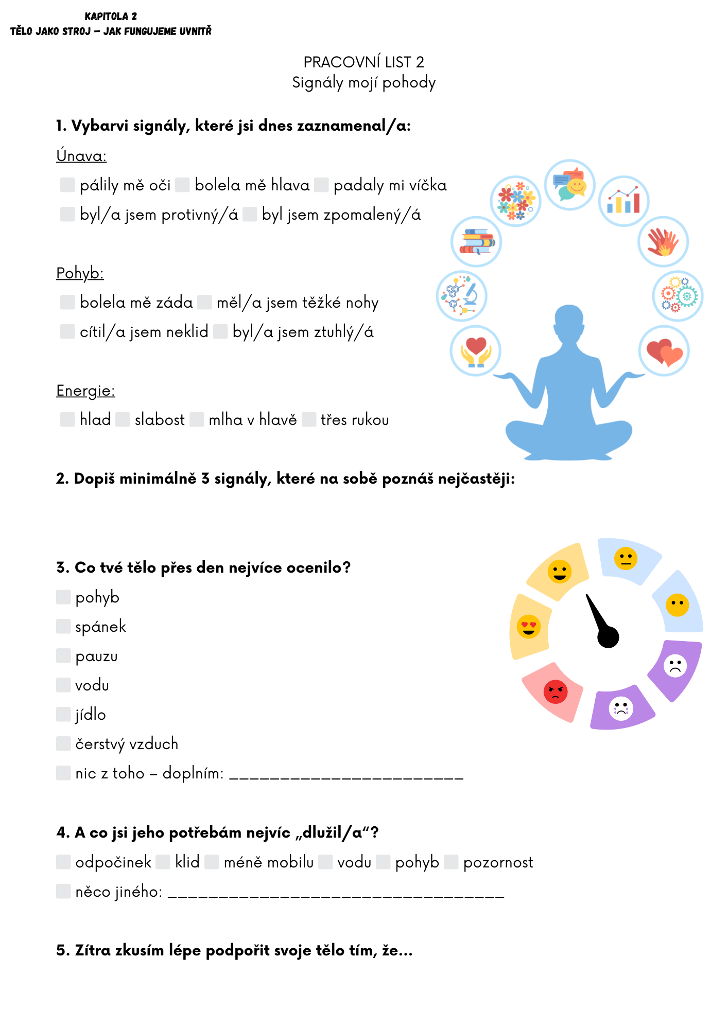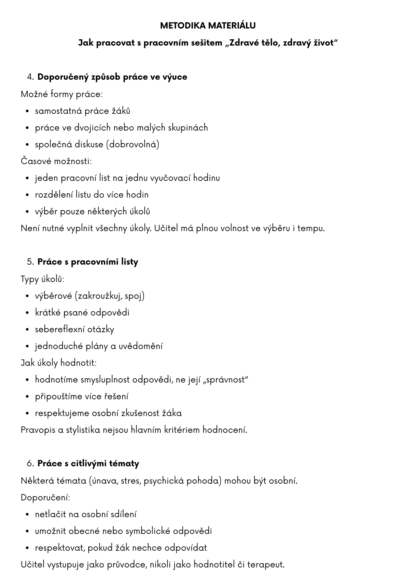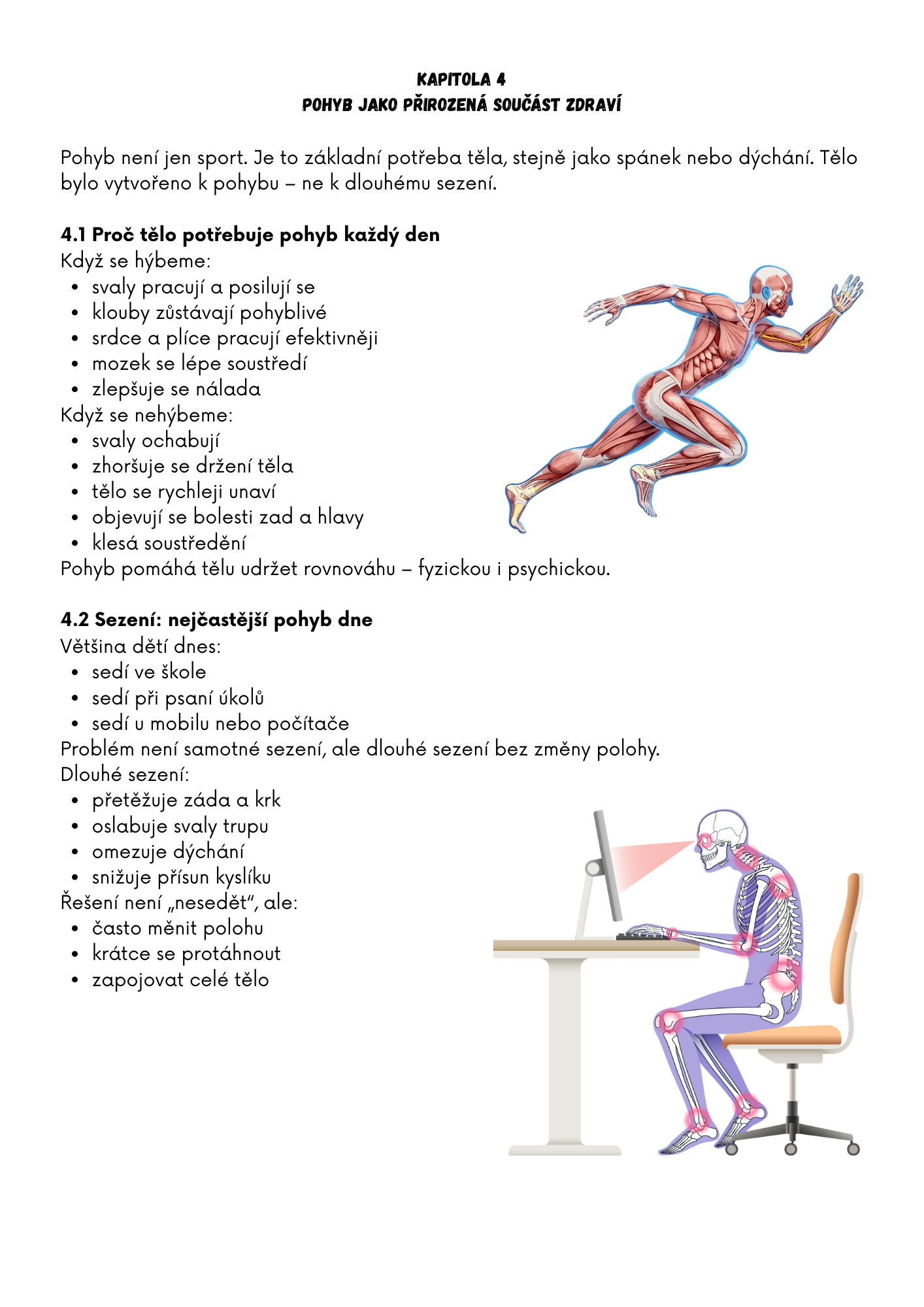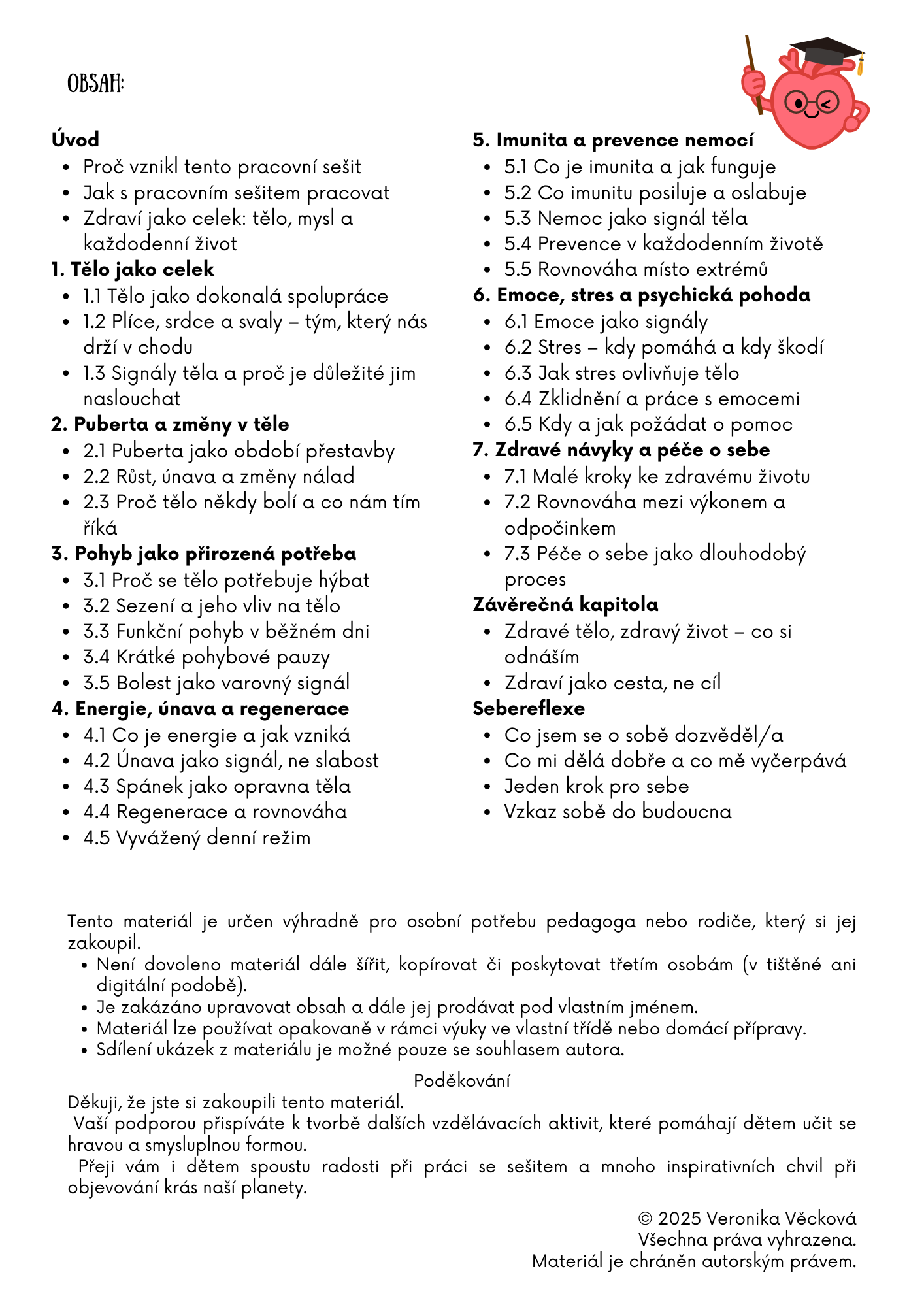 Materiál vede žáky k lepšímu porozumění vlastnímu tělu, změnám v období dospívání a souvislostem mezi pohybem, odpočinkem, stresem a každodenním fungováním. Důraz je kladen na uvědomění, sebereflexi a malé reálné kroky, nikoli na výkon nebo hodnocení.