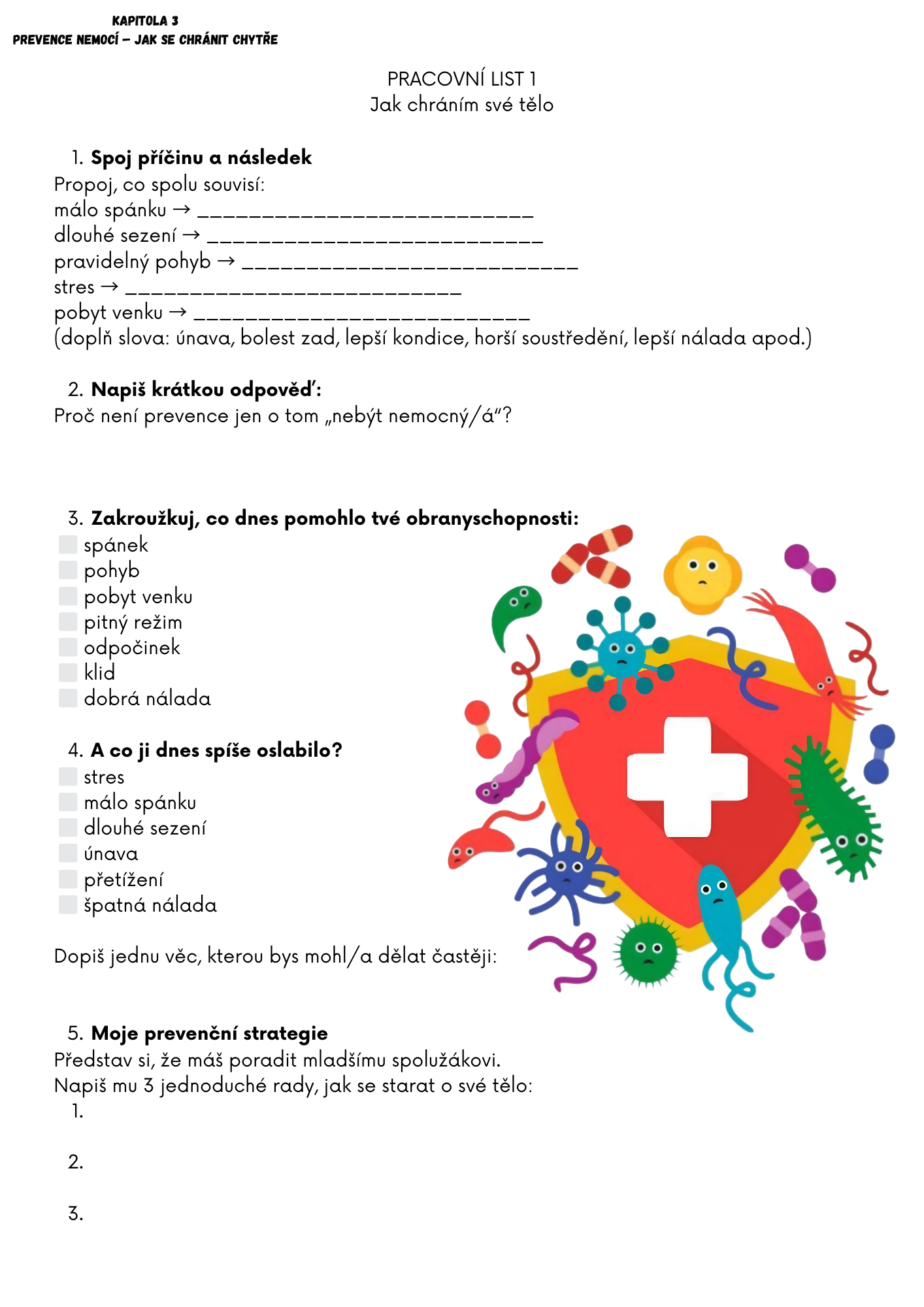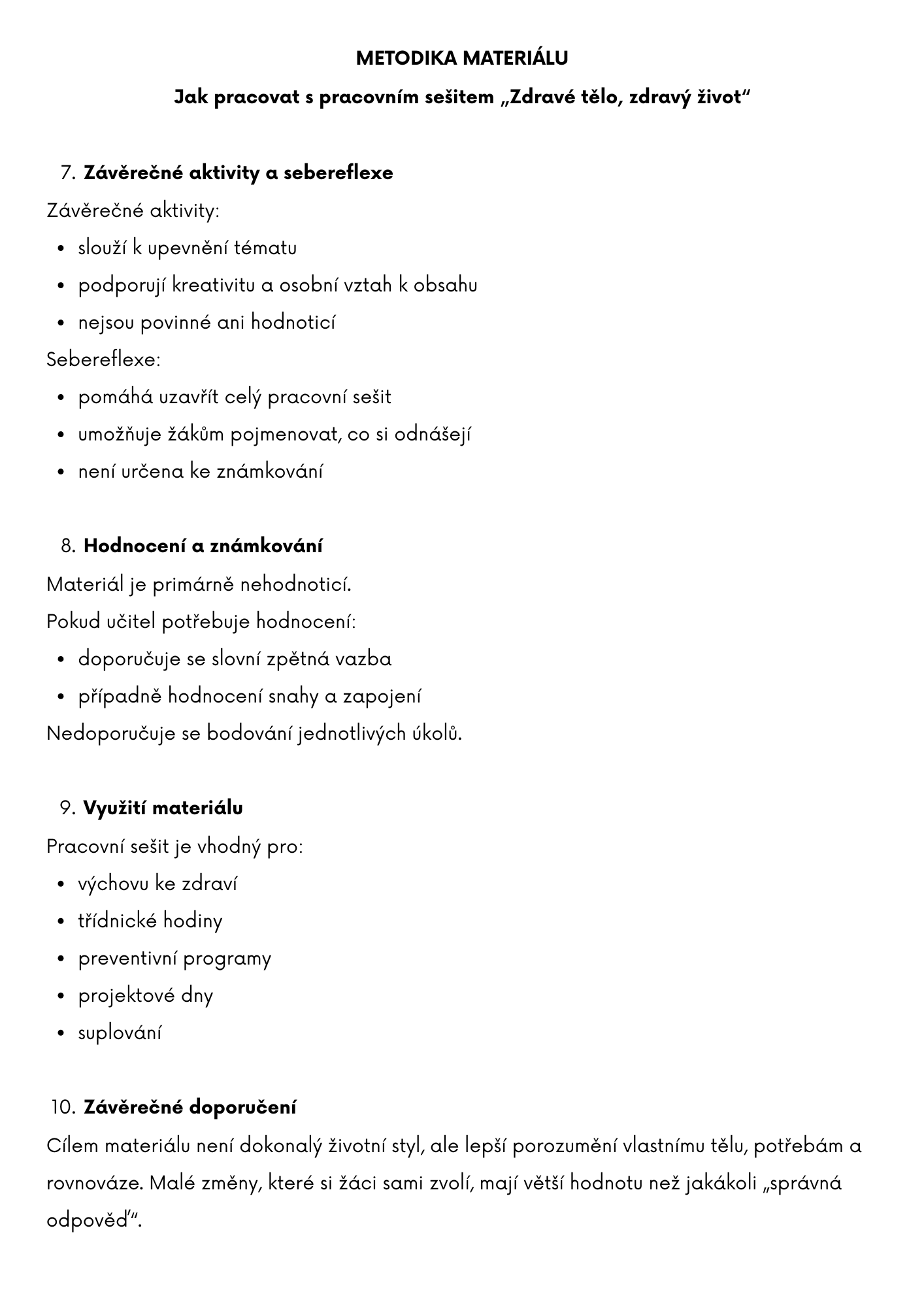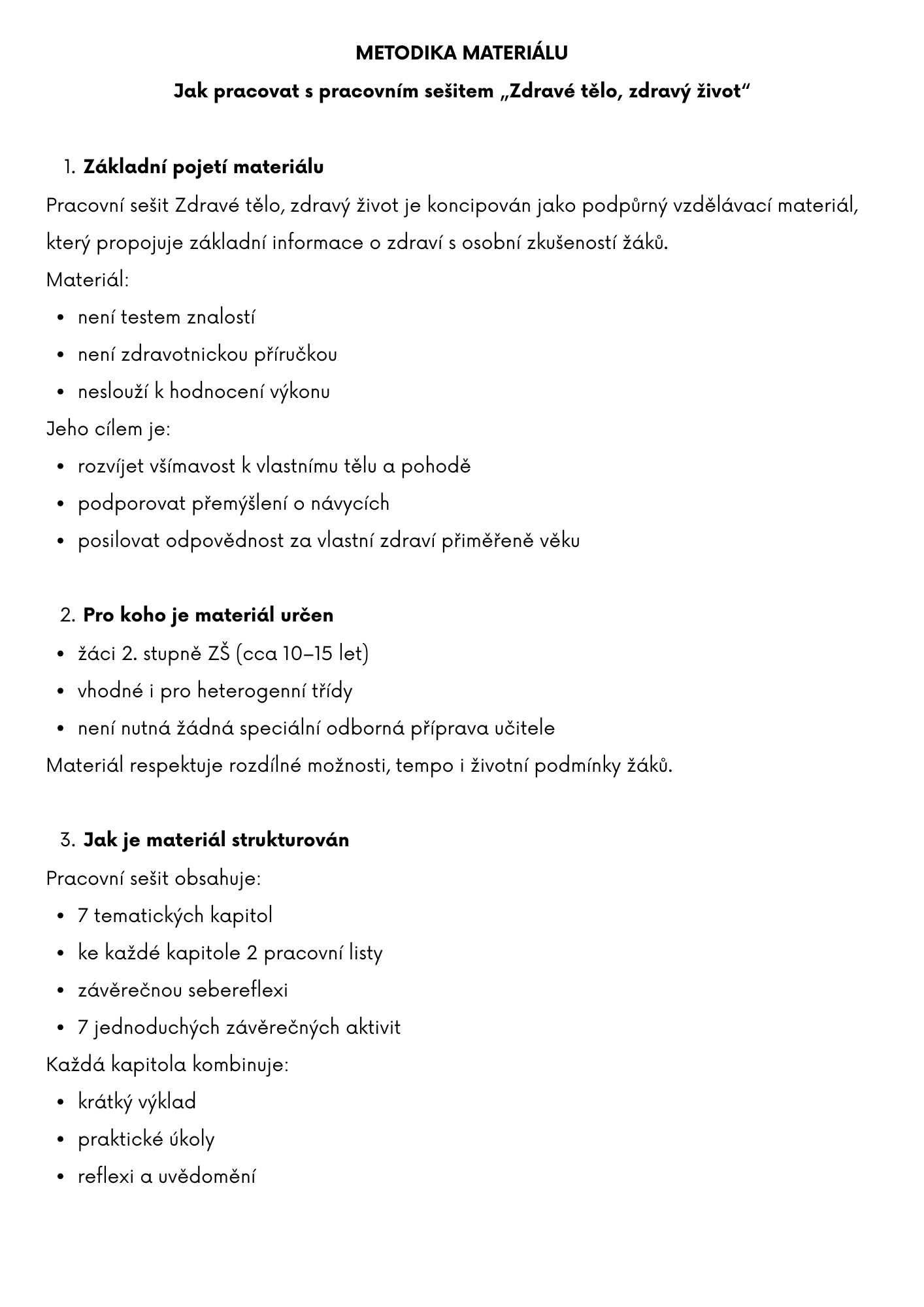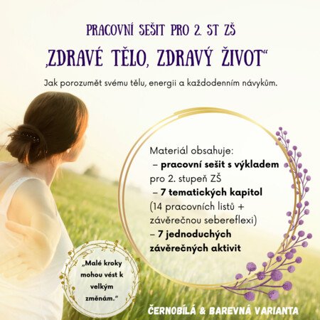 Pracovní sešit Zdravé tělo, zdravý život je určen pro žáky 2. stupně základních škol a zaměřuje se na prevenci nemocí, pohyb, regeneraci, psychickou pohodu a vytváření zdravých návyků.