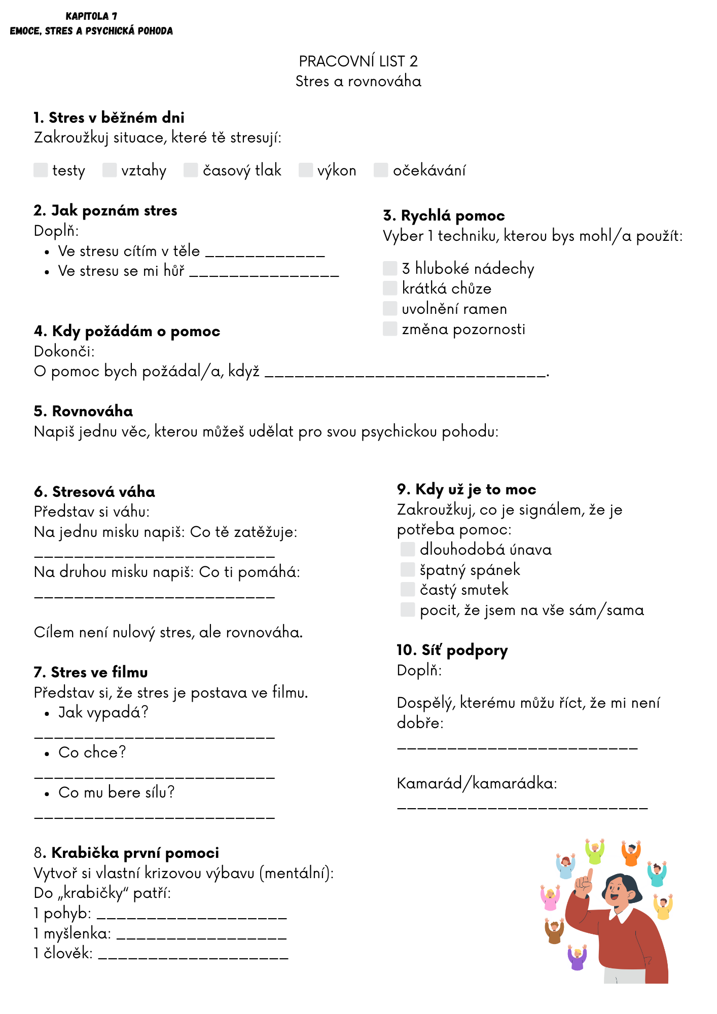 Pracovní sešit obsahuje 7 tematických kapitol, ke každé jsou zpracovány 2 pracovní listy (celkem 14 pracovních listů), doplněné o závěrečnou sebereflexi a 7 jednoduchých závěrečných aktivit. Úkoly jsou různorodé (výběr, psaní, spojování, reflexe) a podporují aktivní zapojení žáků.