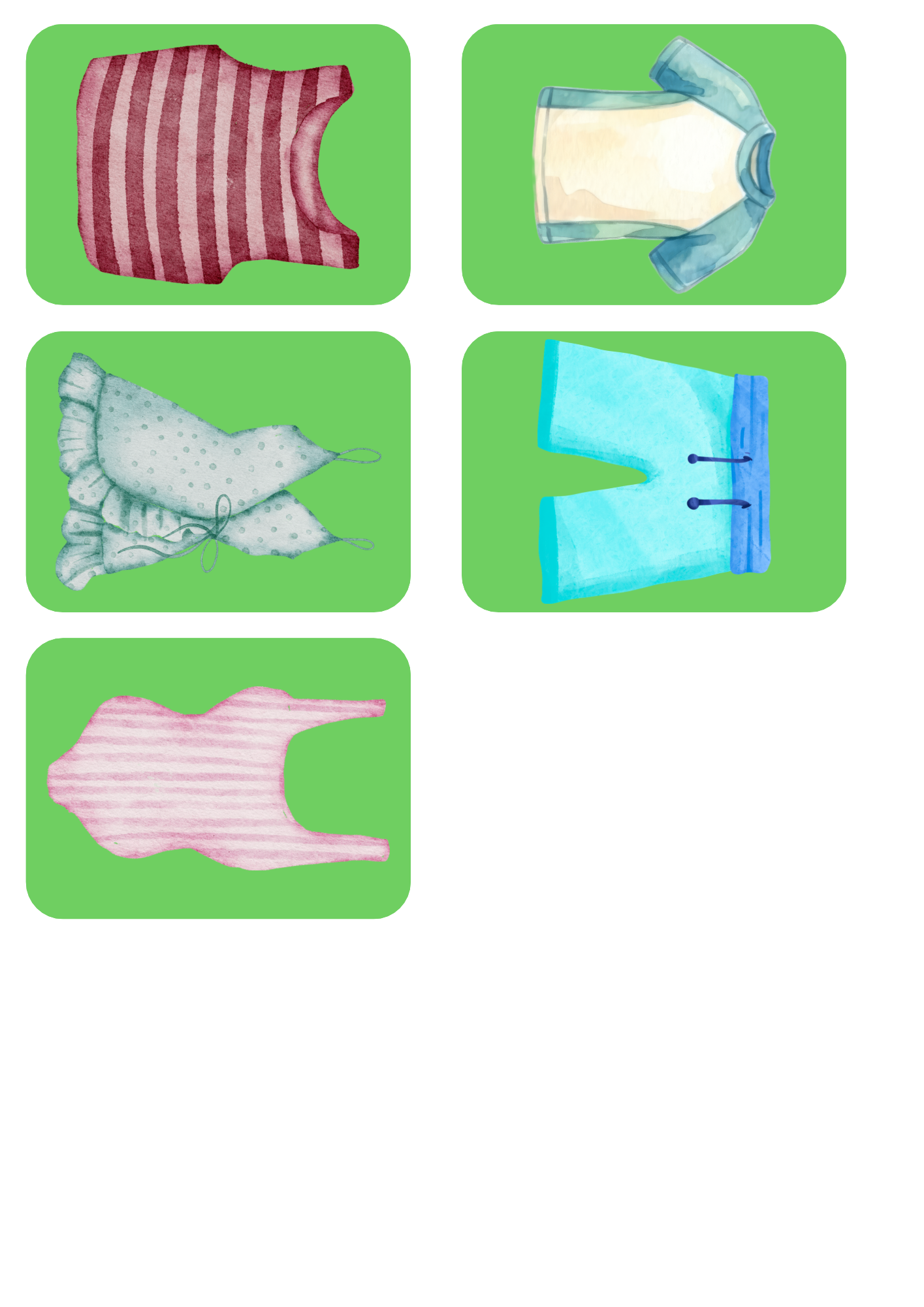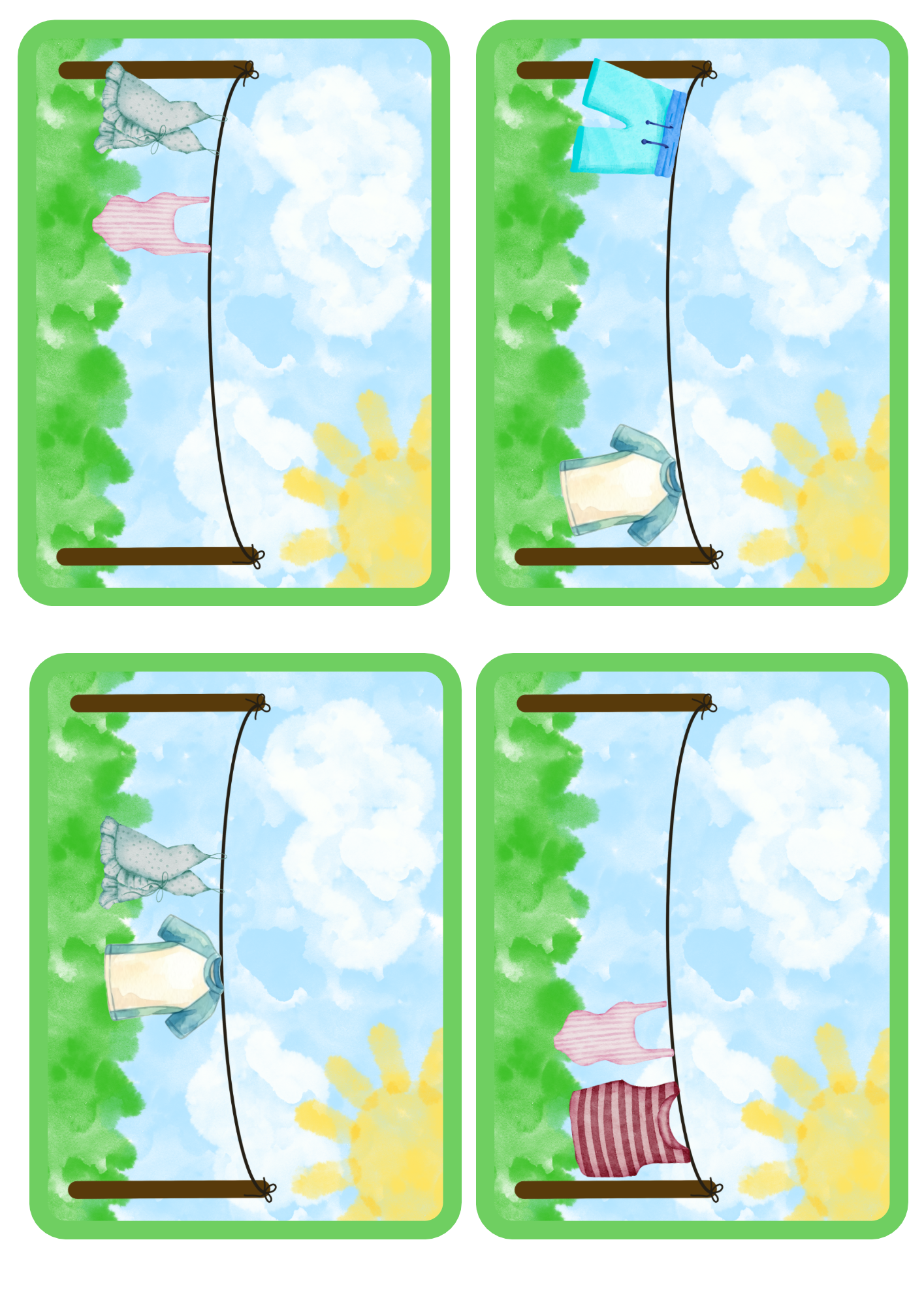 Didaktická aktivita, při které děti řadí oblečení na šňůru podle předlohových karet. Rozvíjí zrakové vnímání, pozornost, logické myšlení a práci podle vzoru.