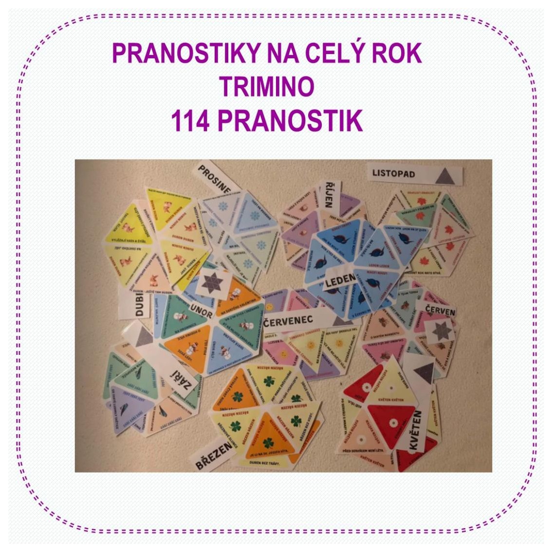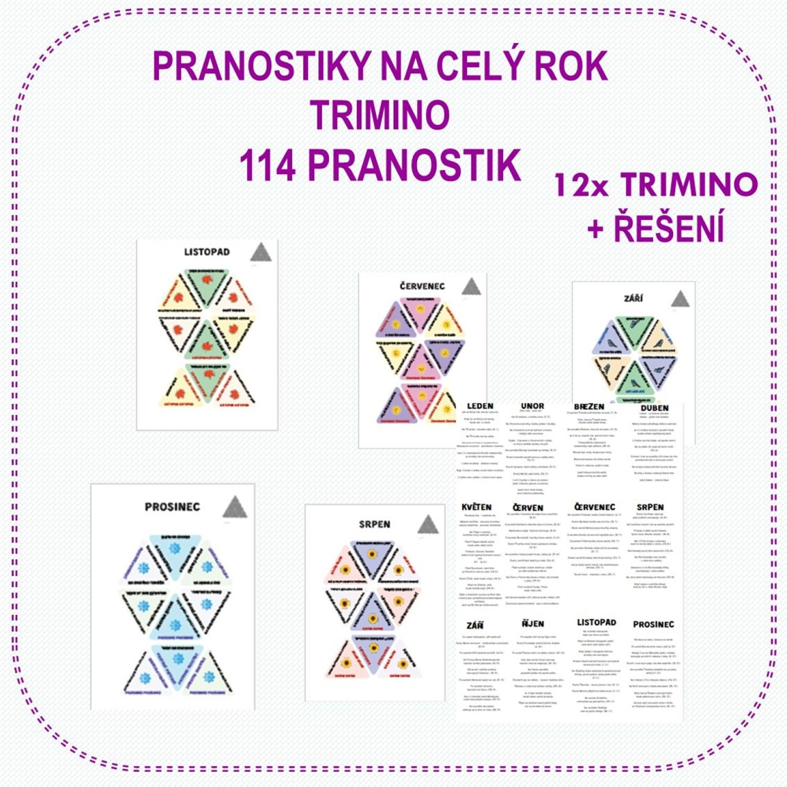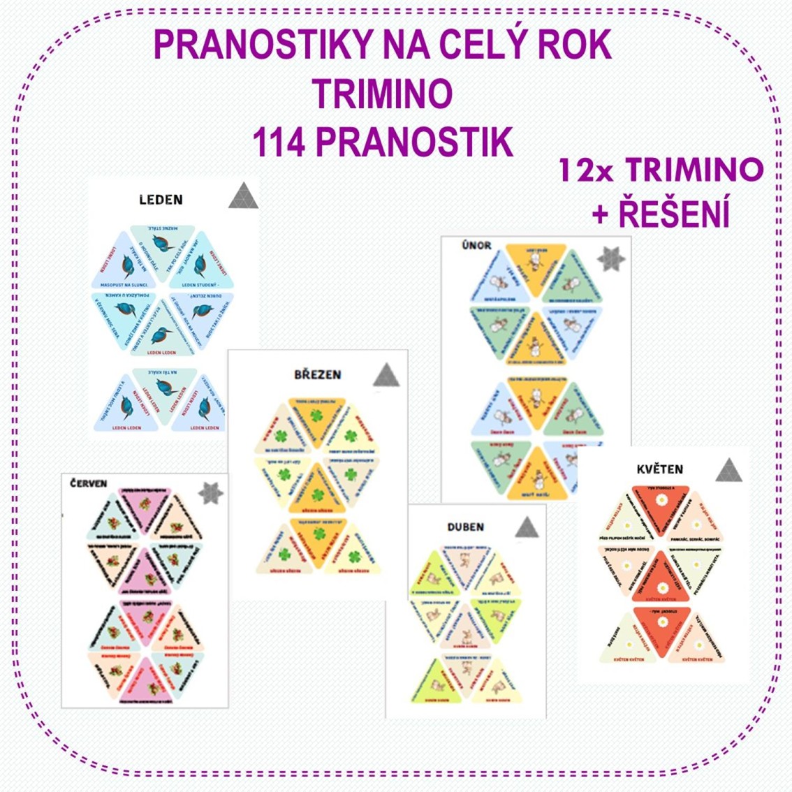 PRO ŽÁKY 1. i 2. STUPNĚ ZŠ Materiál obsahuje 12 karet - 12 TRIMIN rozdělených do jednotlivých měsíců. Lze použít bez přípravy na hodinu. Obsahuje řešení. TRIMINA žáky baví.