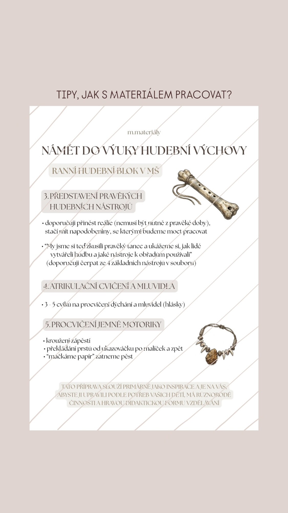 • doporučení : po stažení materiálu budete mít pomůcky nejen na jednu hodinu / jeden blok, zapojte k hudební výchově i fyzické ukázky - hudební nástroje, písničky, tance a další (podrobnější informace v materiálech)