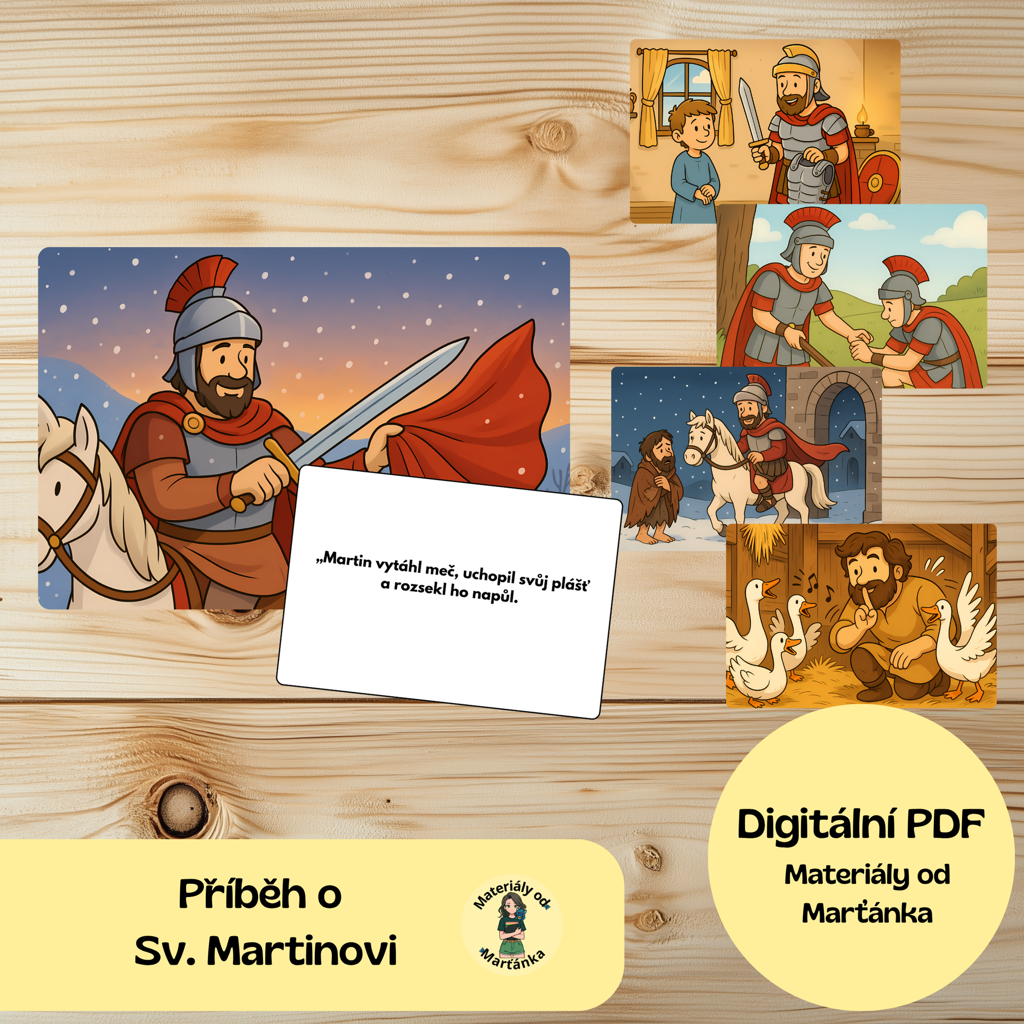 Děti sledují obrázky, zatímco vy jim čtete vyprávění o tom, jak se Martin podělil o svůj plášť, pomohl chudákovi a stal se symbolem dobroty a pomoci.
