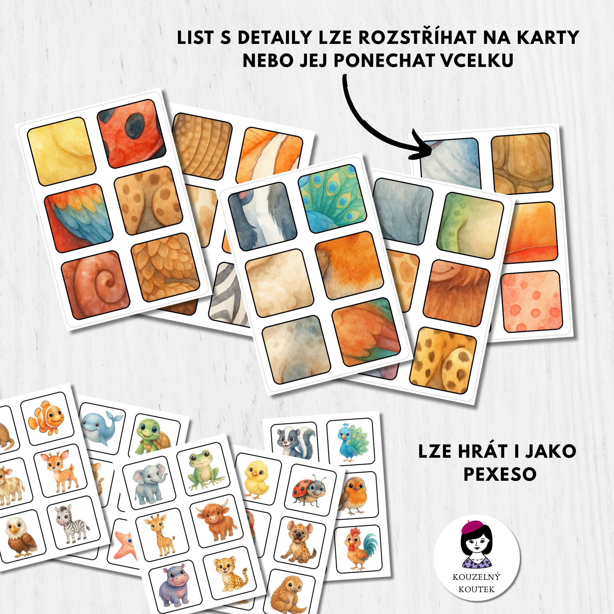 - možnost využít jako pexeso, třídicí hru nebo pracovní listy