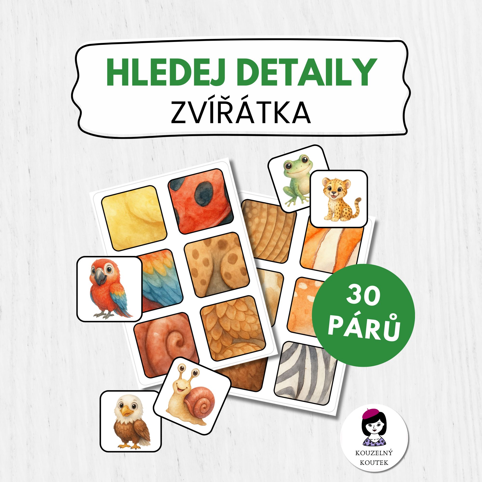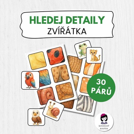 Hravá a vzdělávací aktivita pro děti v předškolním věku. Tento soubor obsahuje 30 zvířátek s jejich typickými vzory srsti a kůže – děti mají za úkol přiřadit zvíře k jeho vzoru.