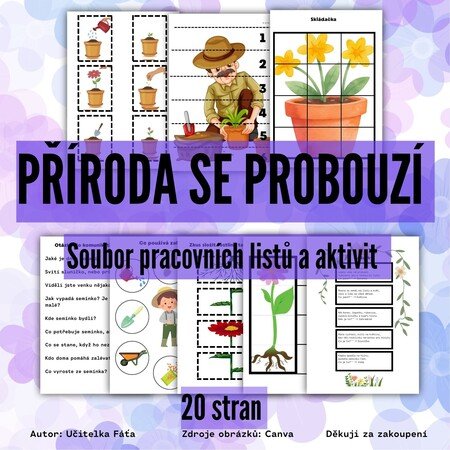 Materiál je vhodný pro tematický celek jaro – příroda se probouzí a lze jej využít při práci ve třídě, v centrech aktivit i při společných hrách s dětmi. 🌷