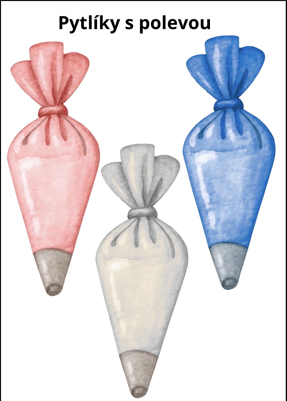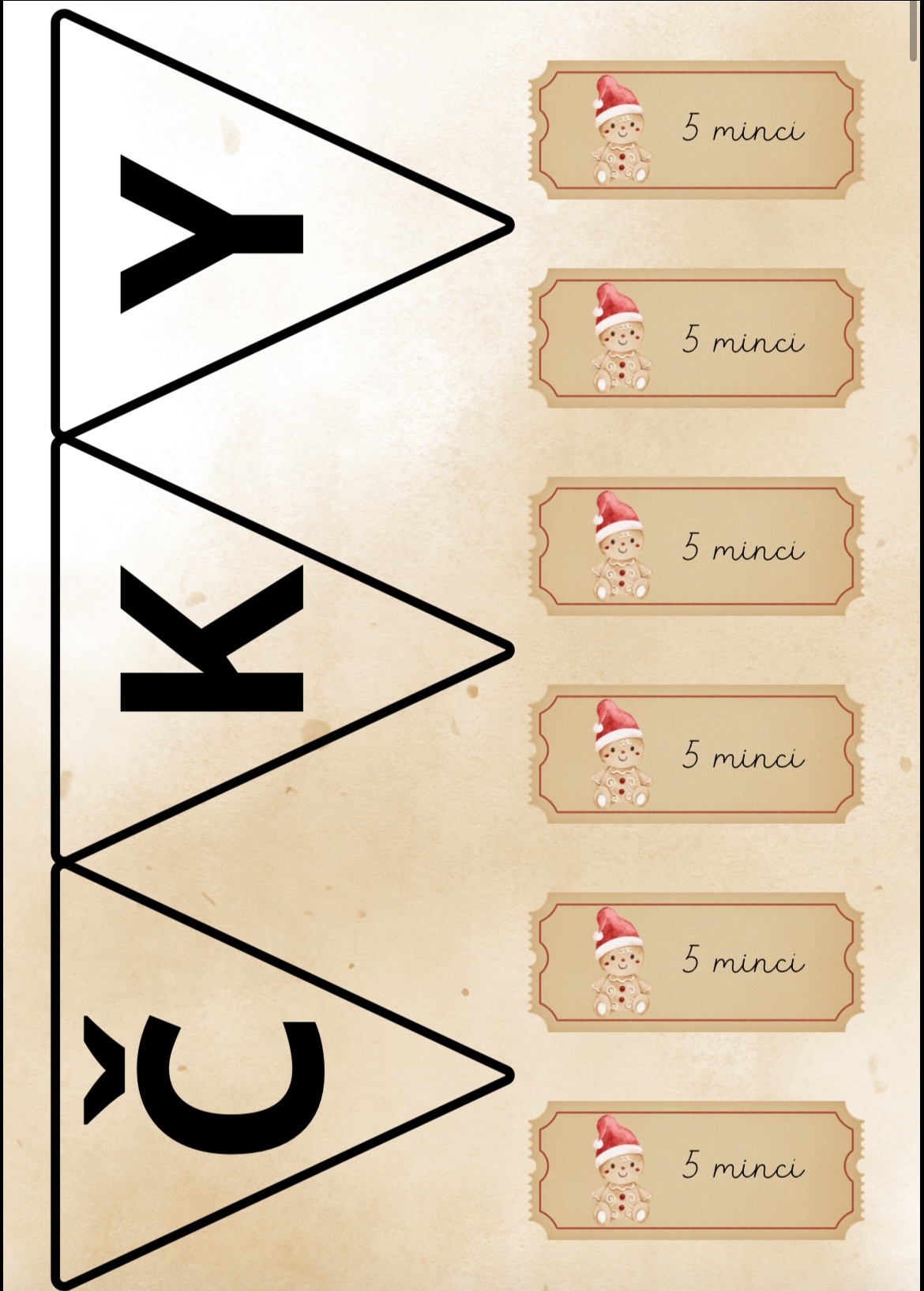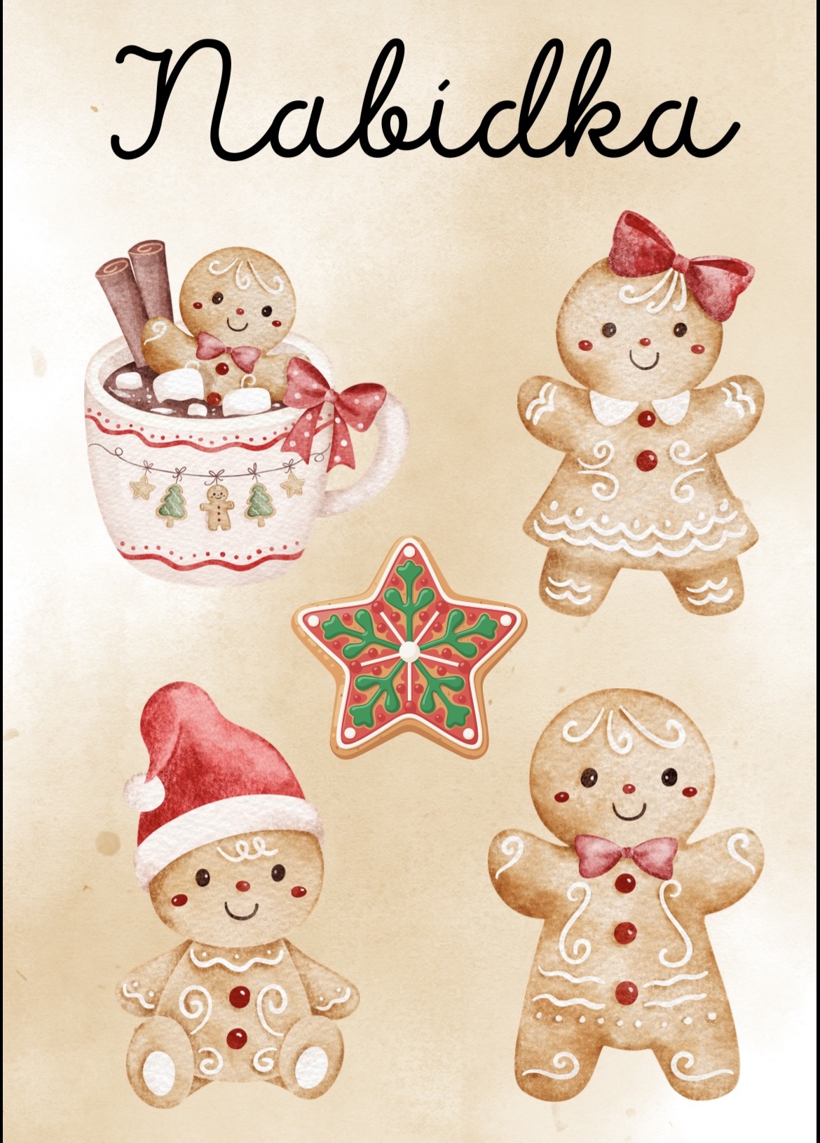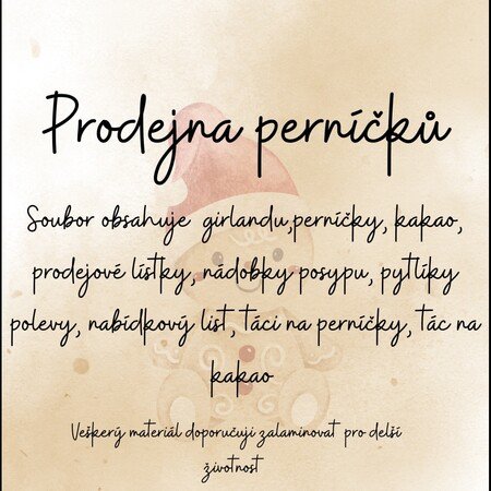 Soubor obsahuje girlandu,perníčky, kakao, prodejové lístky, nádobky posypu, pytlíky polevy, nabídkový list, táci na perníčky, tác na kakao.
