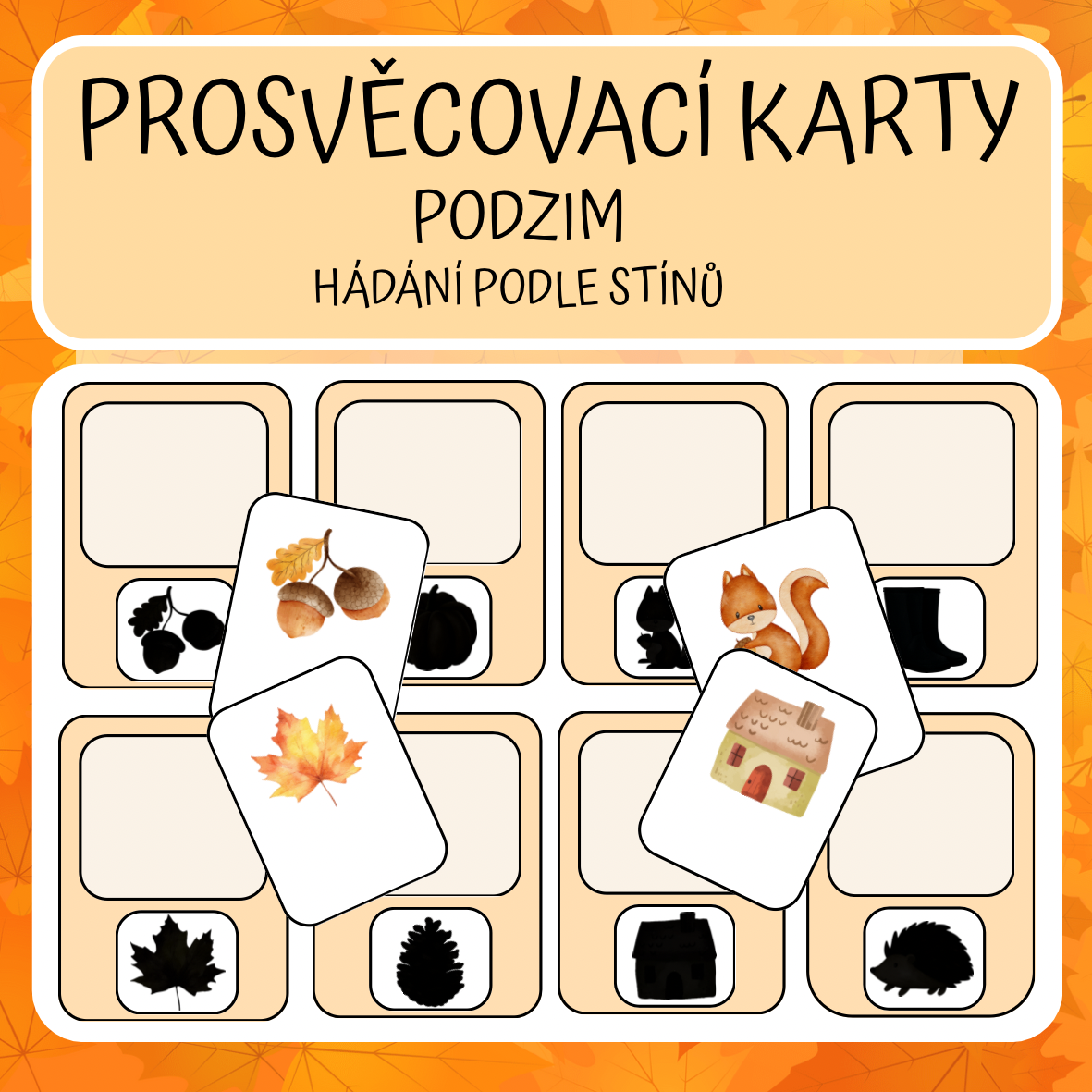 18 prosvětlovacích kartiček, na kterých děti nejprve hádají, jaký předmět vytvořil daný stín.