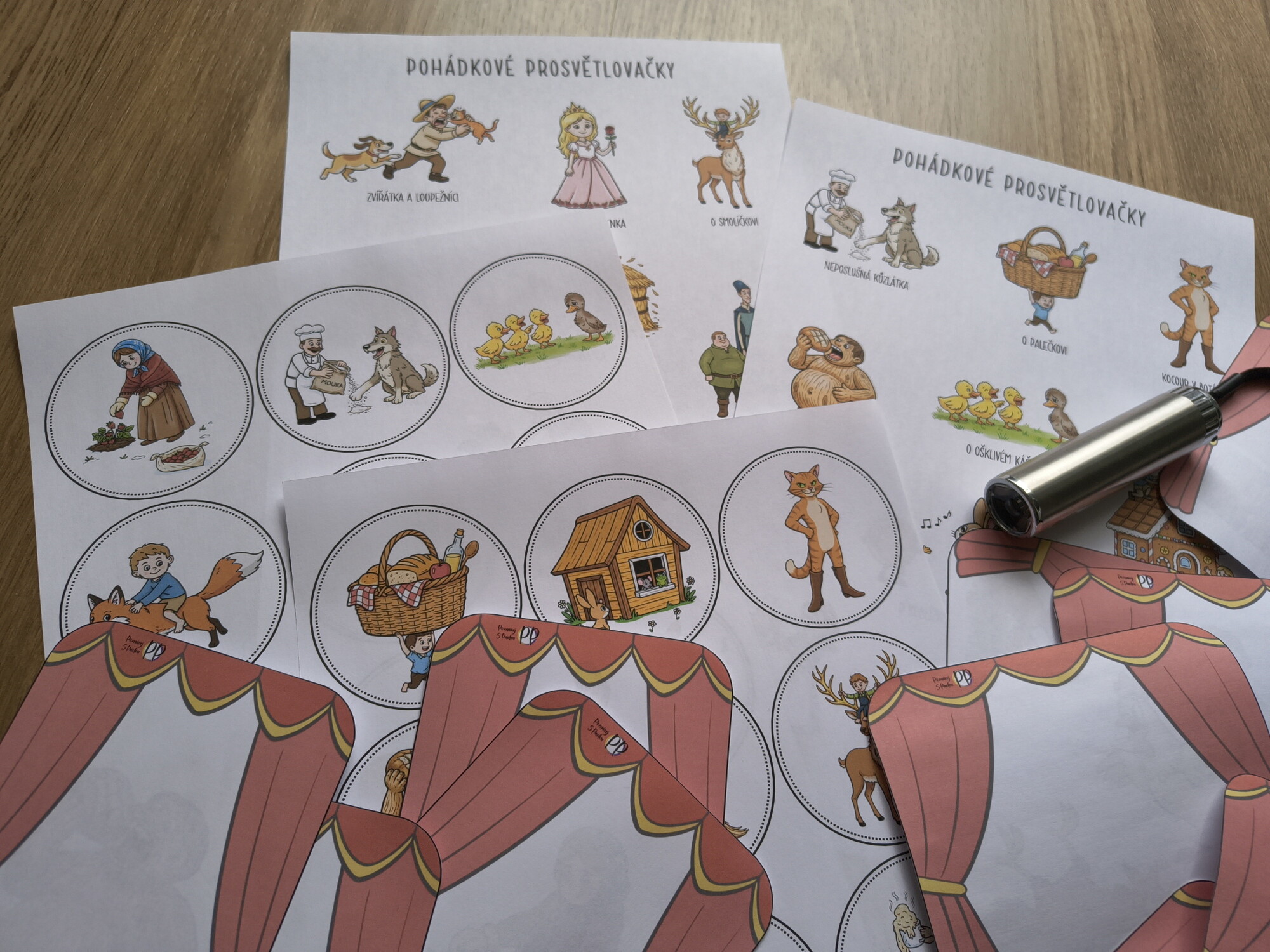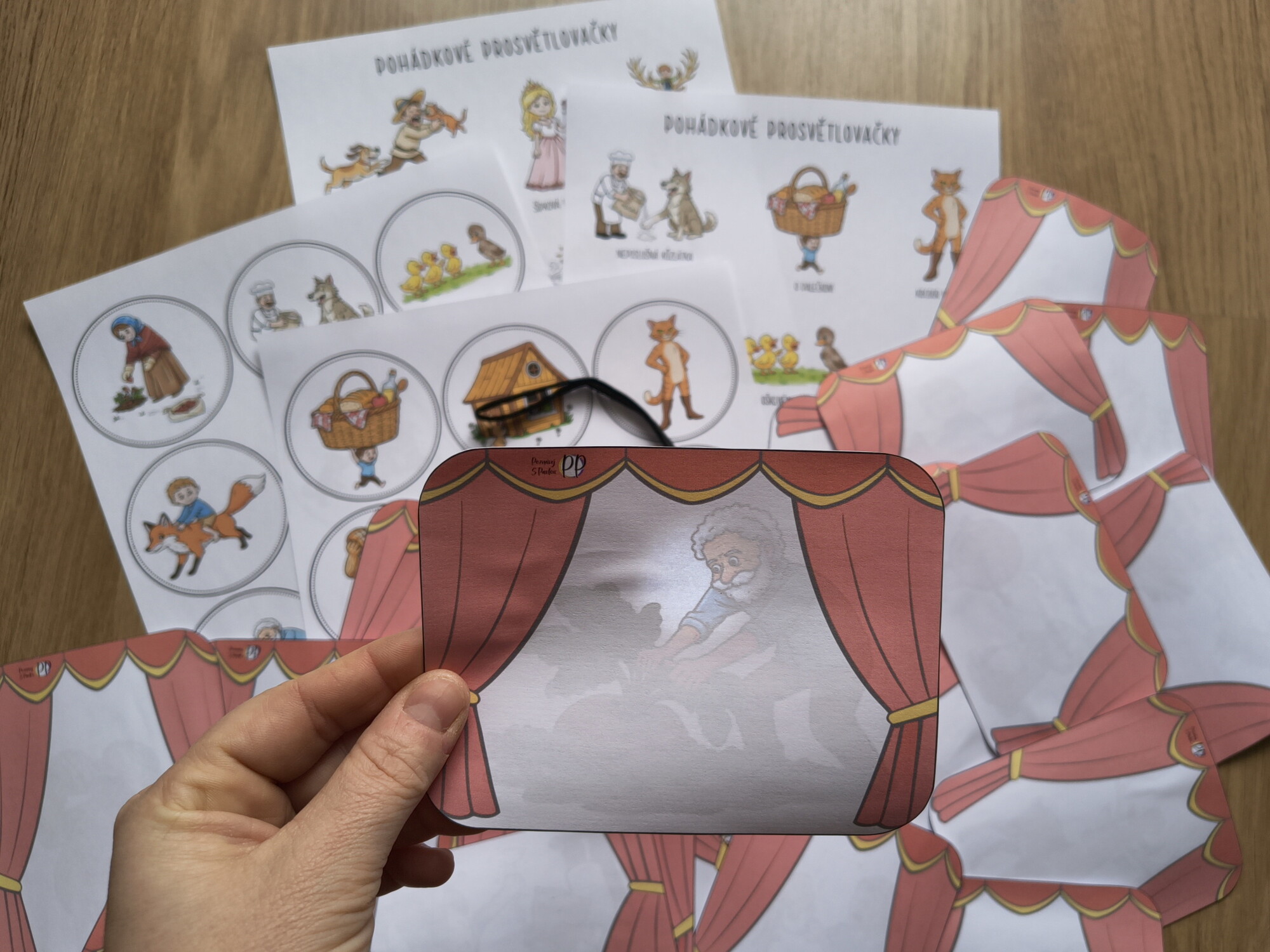 V PDF najdete 20 karet ve velikosti 9x12 cm s nejznámějšími pohádkami, které většina dětí dobře zná. Mezi pohádkami nechybí Červená Karkulka, Perníková chaloupka, O koblížkovi, O neposlušných kůzlátkách, Tři prasátka a mnoho dalších. Úkolem dětí je pomocí světla prosvítit obrázkové karty a zjistit, jaká pohádka se odehrává za divadelní oponou.