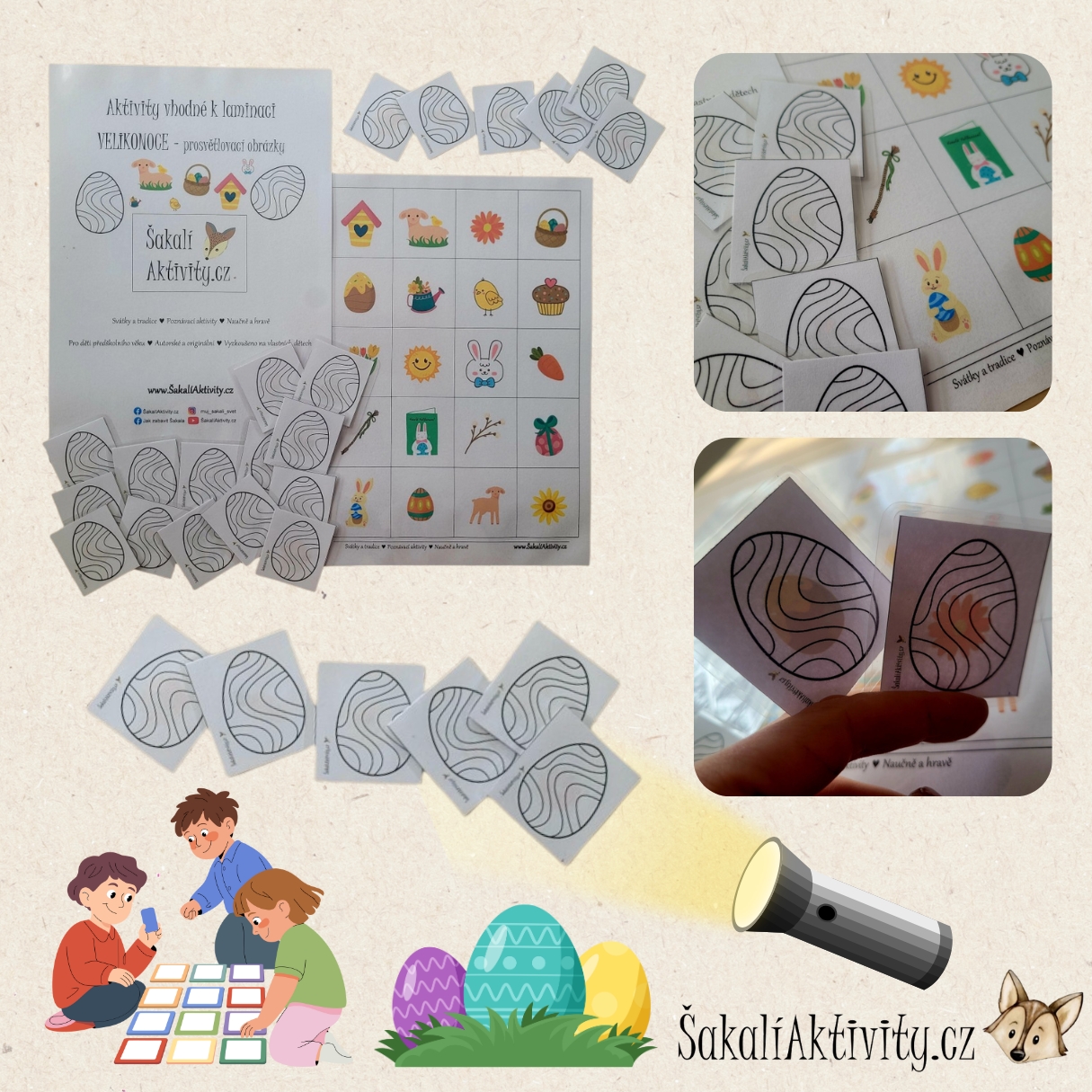 Na první pohled obyčejná karta s obrázkem vejce, na které se po prosvícení u okna, nebo lampičky objeví obrázky. Součástí souboru je také předlohová tabulka se všemi obrázky!