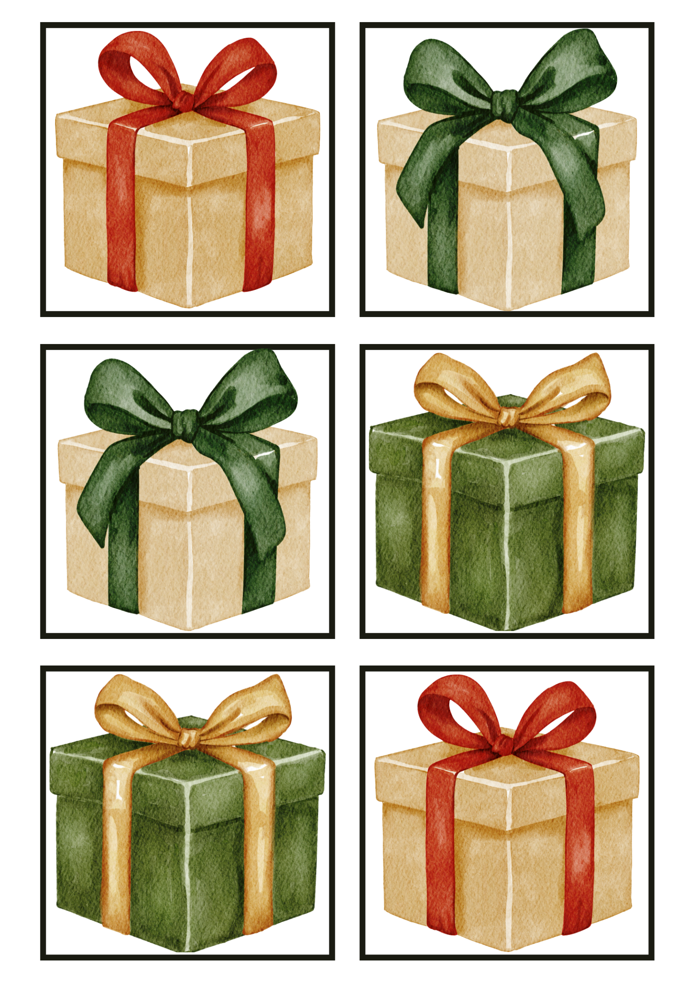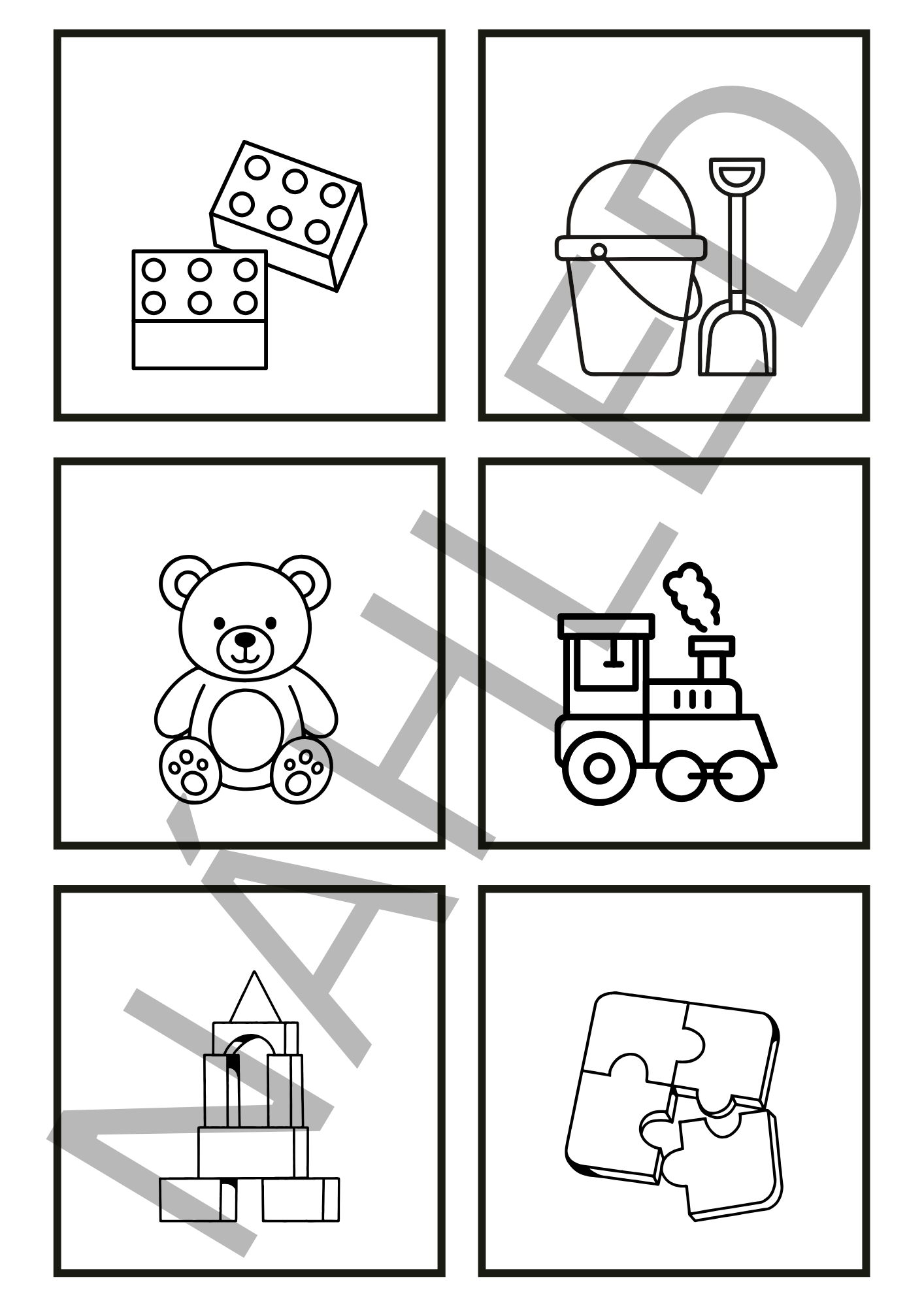 Soubor obsahuje 1 stránku s šesti obrázky zabalených dárků a 6 stránek černobílých obrázků hraček.