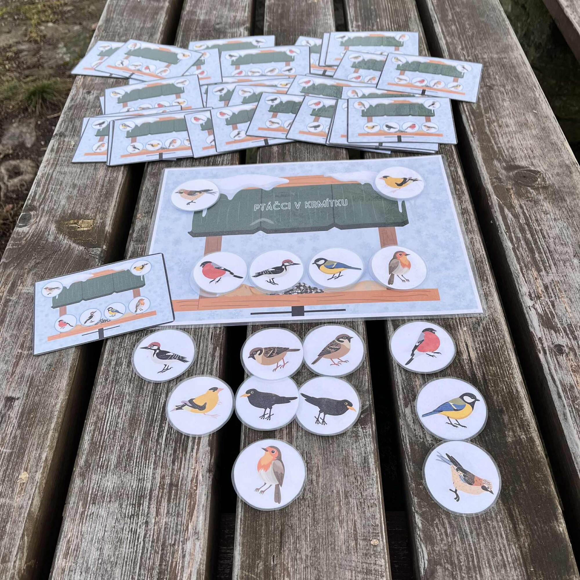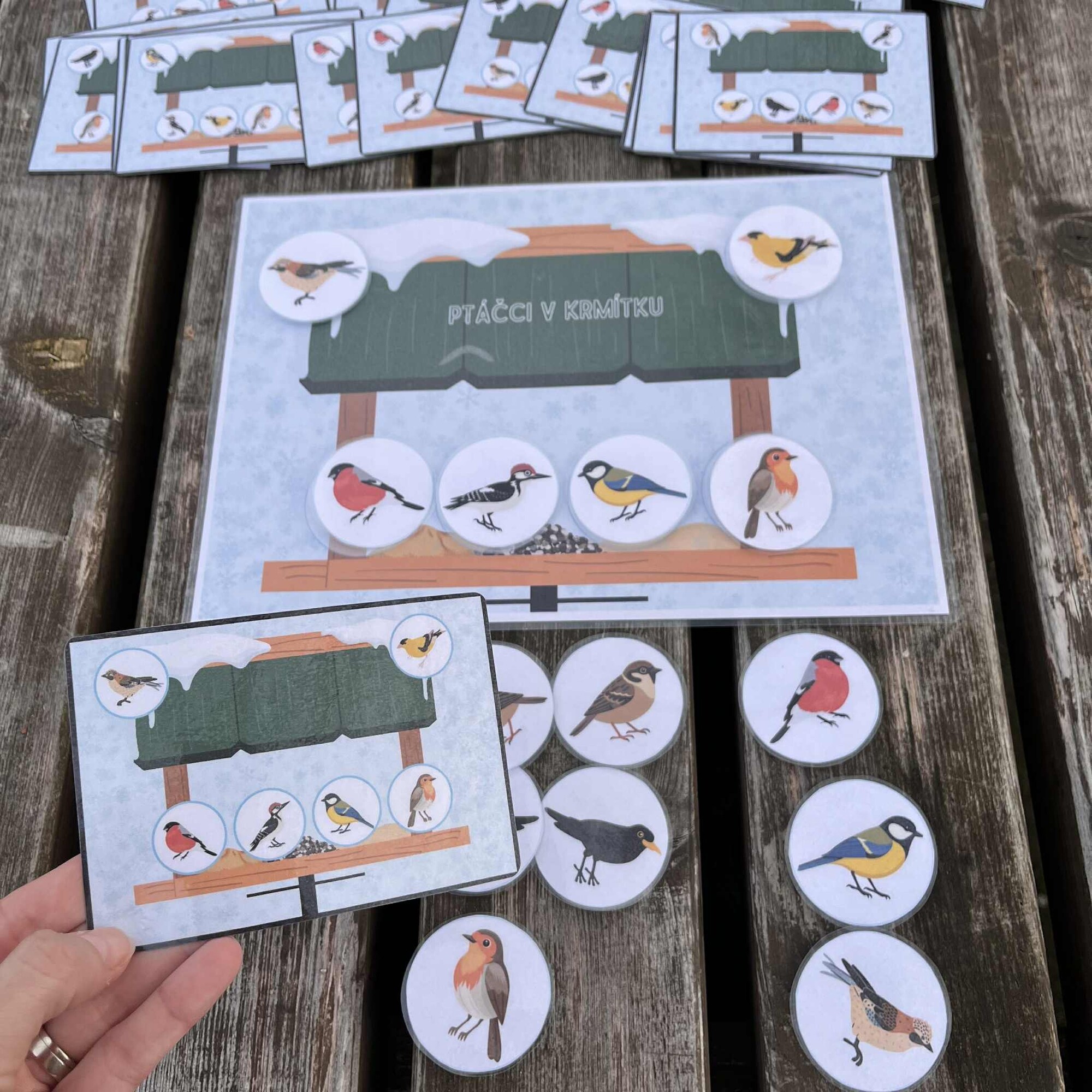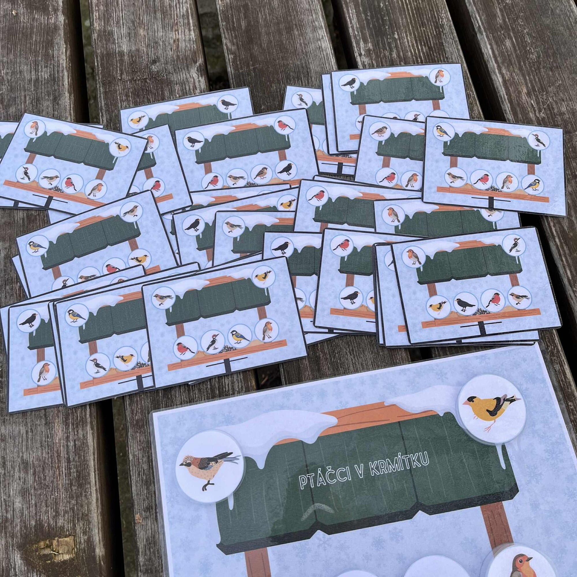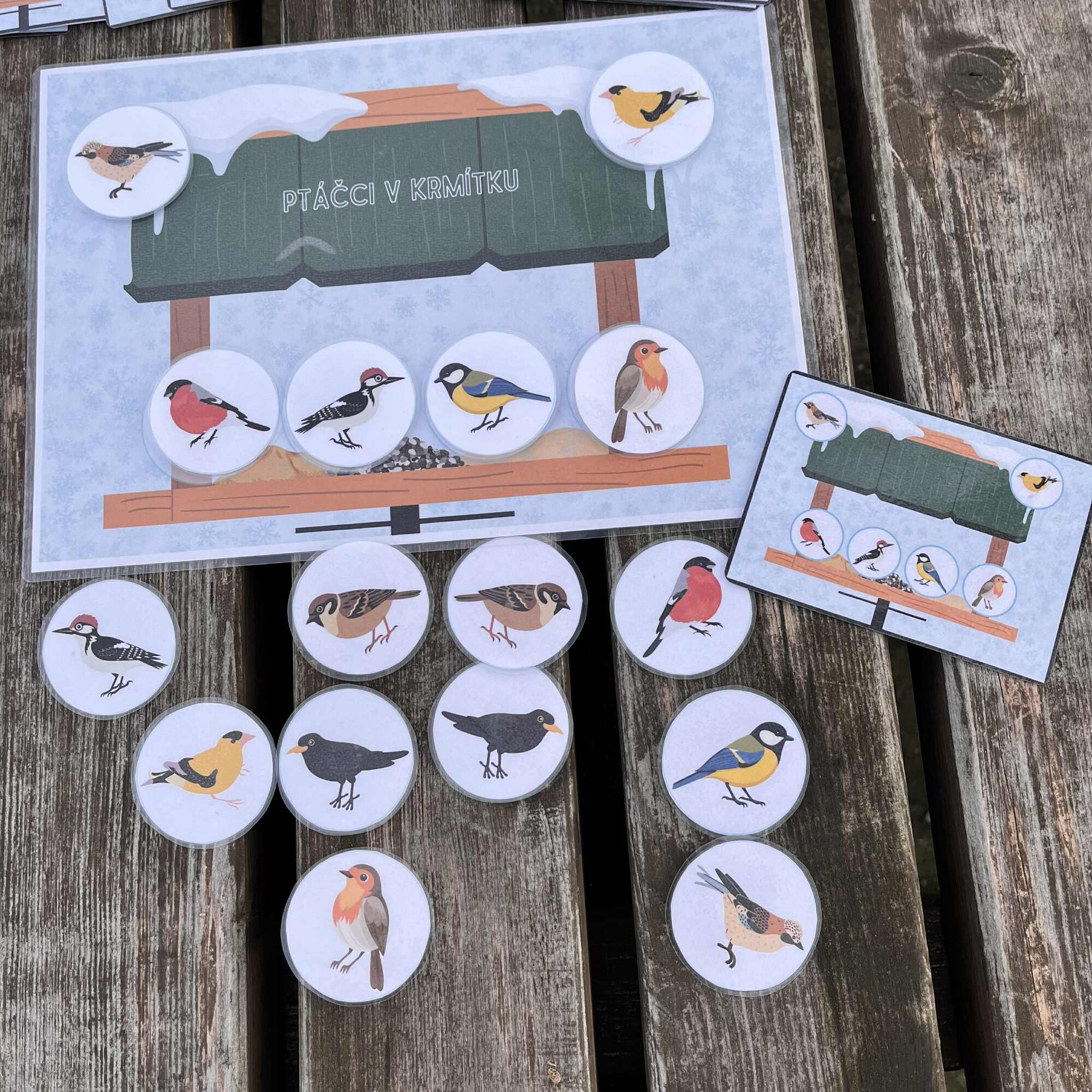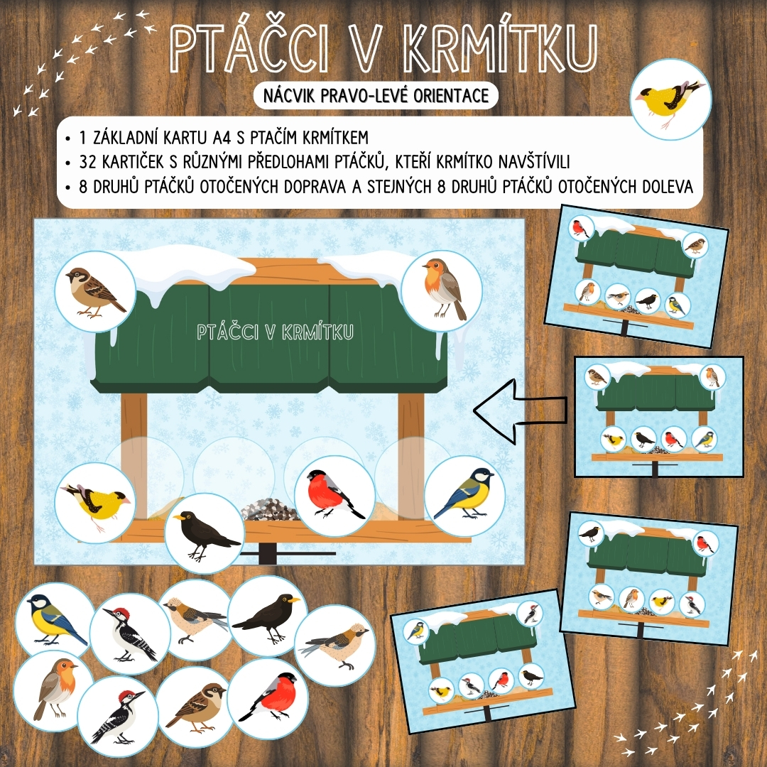 Soubor obsahuje základní kartu A4 s krmítkem, 32 předlohových kartiček a 8 ptáčků otočených doprava a stejných 8 otočených doleva.