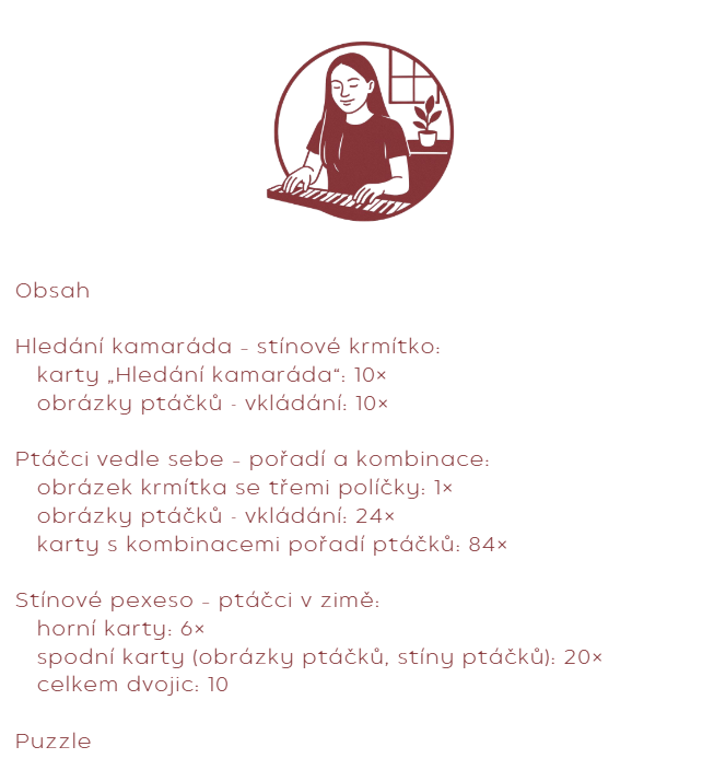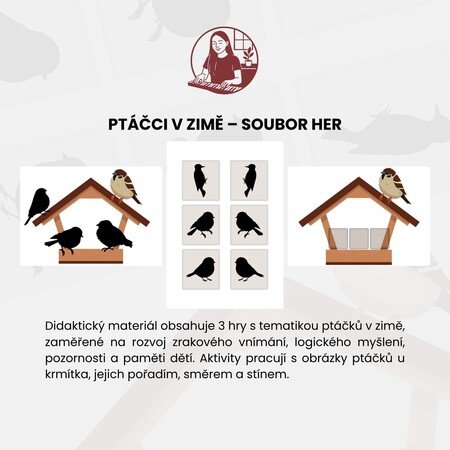Soubor nabízí tři tematicky propojené hry zaměřené na rozvoj zrakového vnímání, logického myšlení, pozornosti a paměti dětí. Materiál je inspirován zimním obdobím a péčí o ptáčky u krmítek a přirozeně podporuje vztah dětí k přírodě.