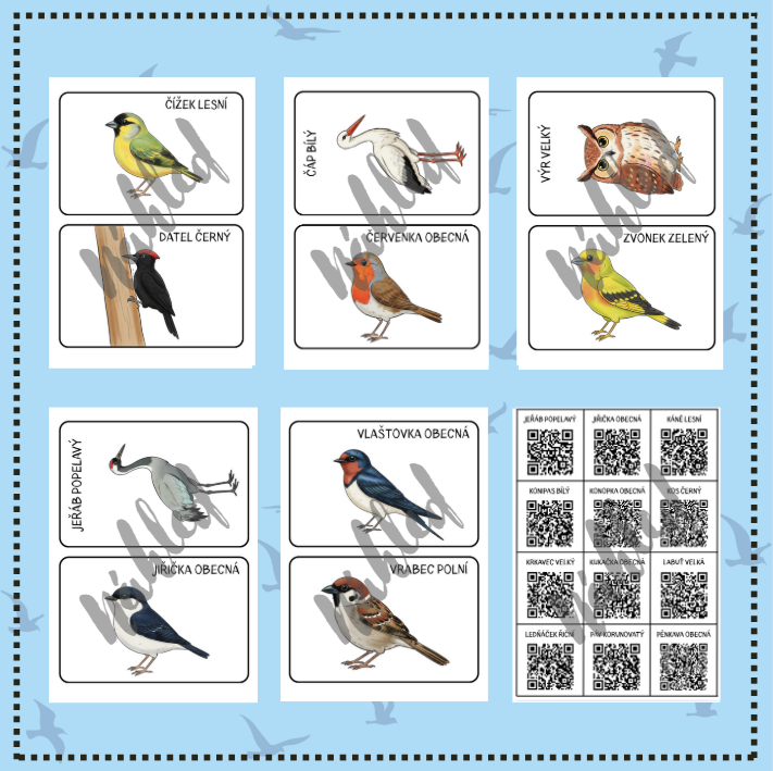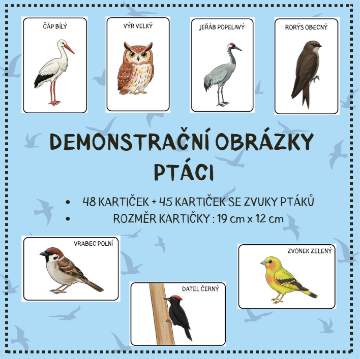 Soubor obsahuje 48 demonstračních obrázků a 45 QR kódů se zvuky ptáků určených pro práci s dětmi. Obrázky jsou větší a názorné, aby byly dobře viditelné pro celou skupinu dětí.