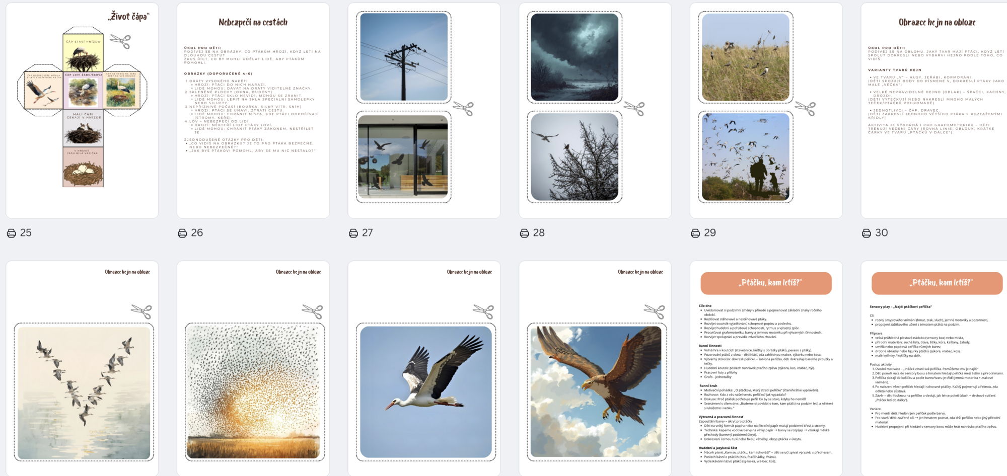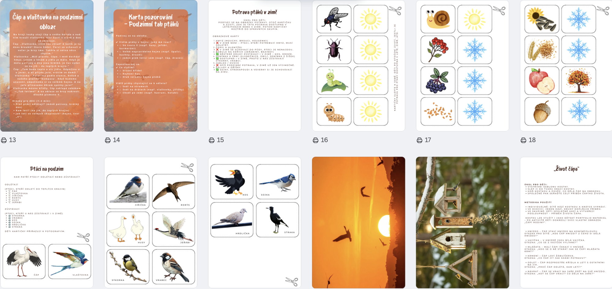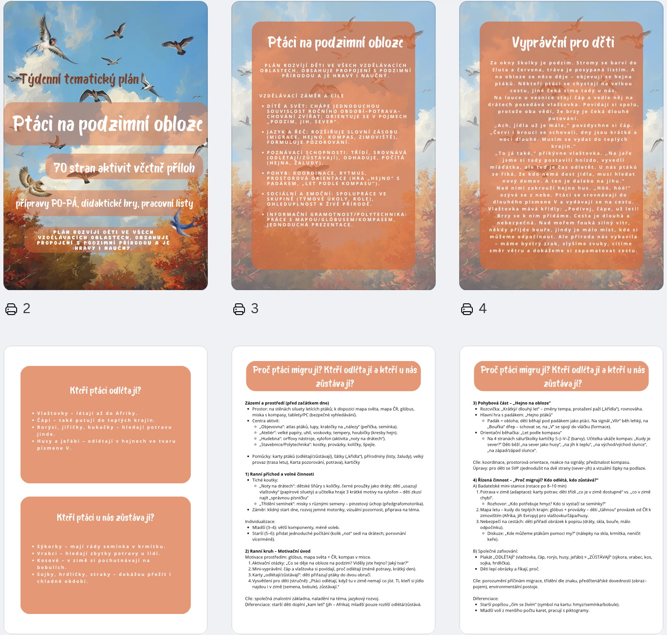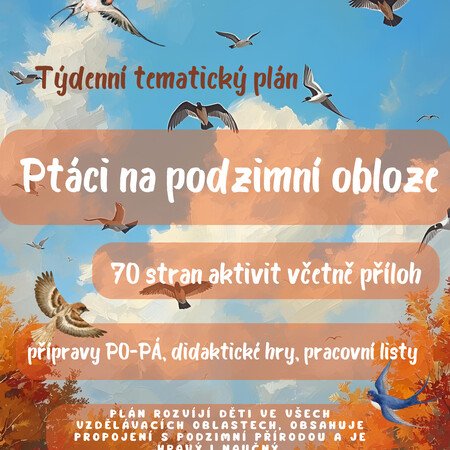 Tento ucelený materiál Vás provede celým týdnem zaměřeným na stěhovavé i stálé ptáky. Najdete v něm přípravy na každý den (PO–PÁ), didaktické hry, pohybové činnosti, pracovní listy i smyslové aktivity. Soubor propojuje podzimní přírodu s environmentální výchovou a přináší dětem nejen nové poznatky, ale i prostor pro hru, tvoření a prožitky.