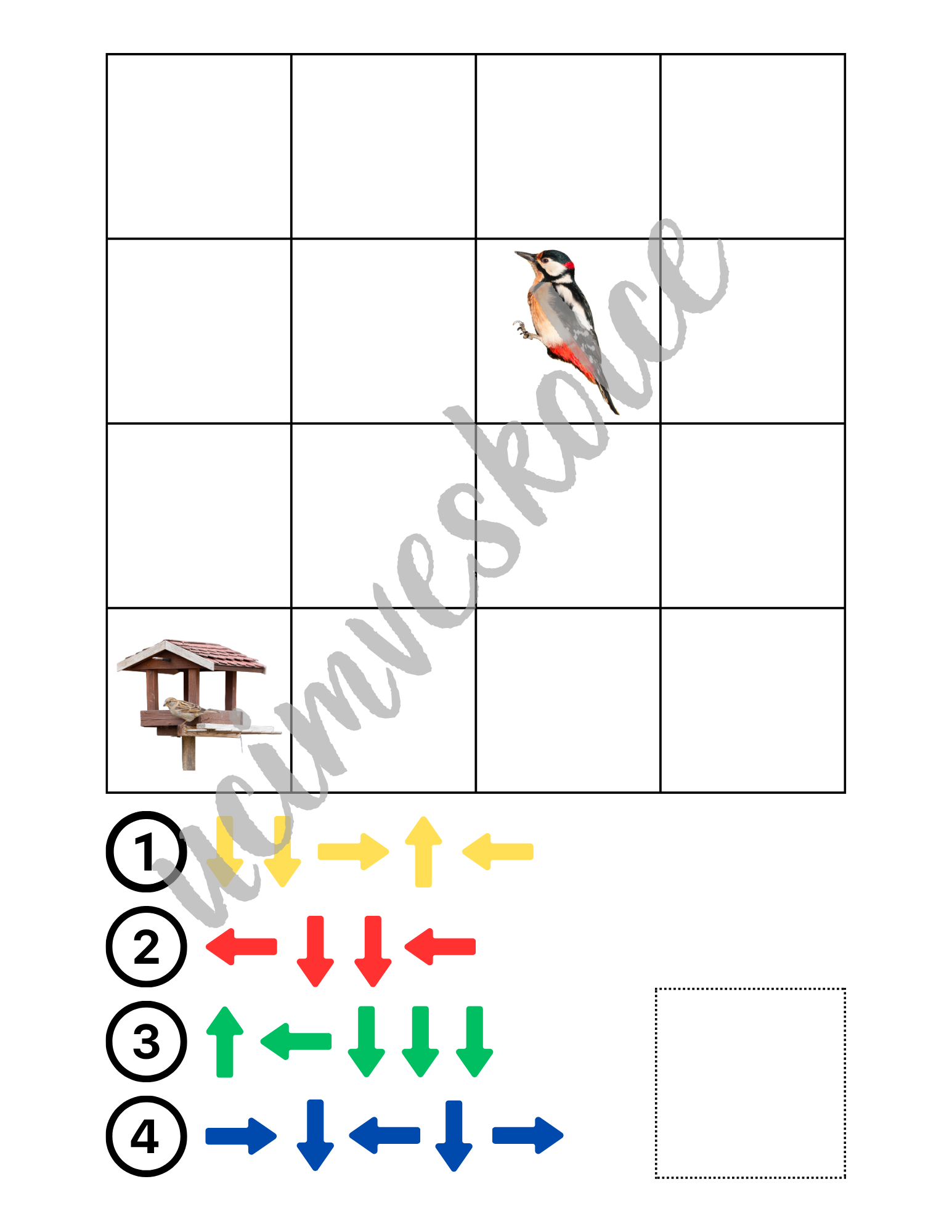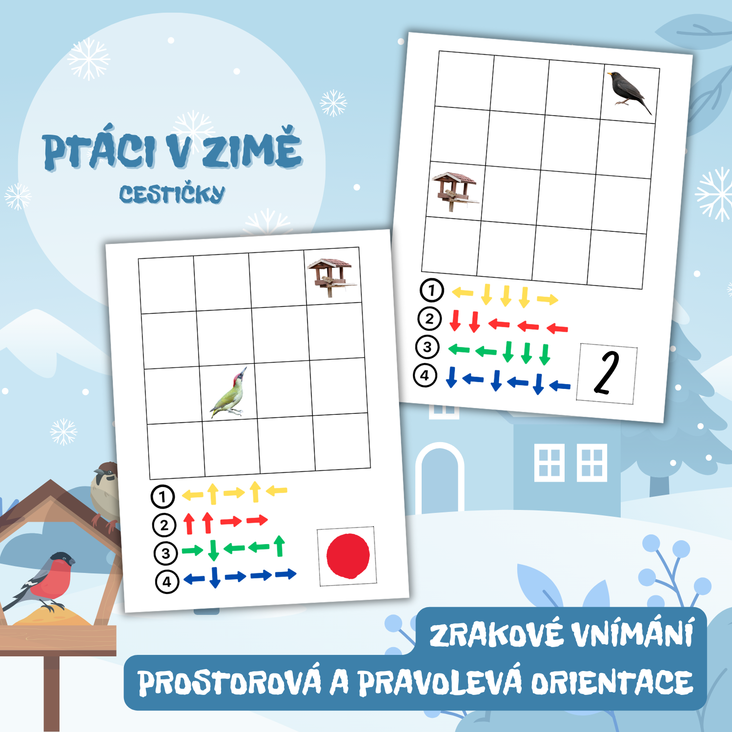 Úkolem dětí je zjistit, která cesta vede z políčka s obrázkem ptáka na políčko s obrázkem krmítka.