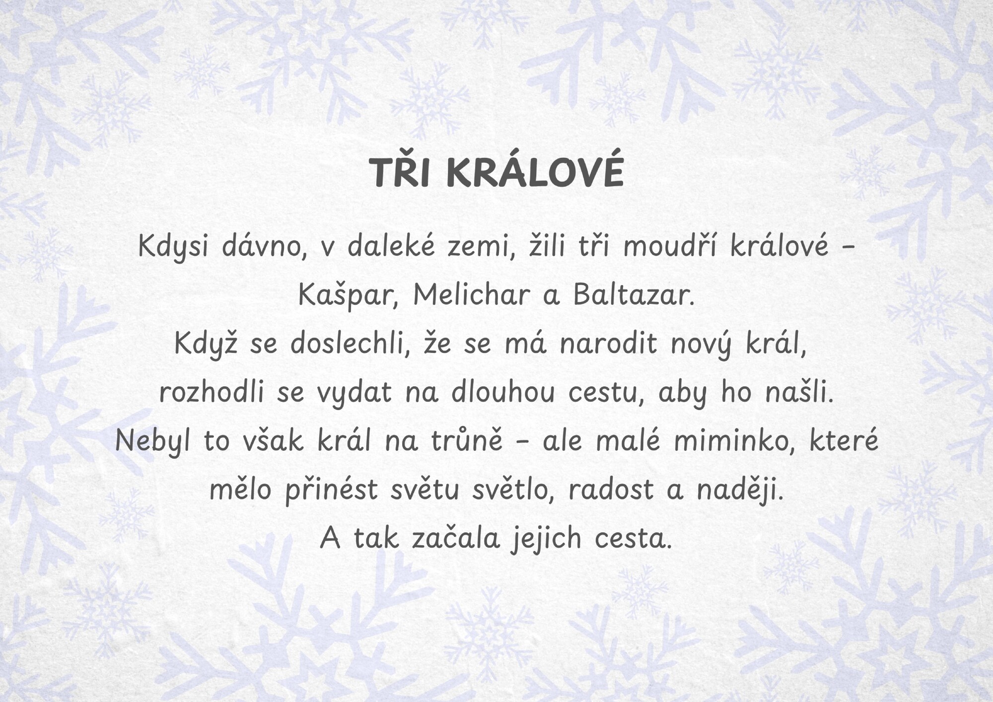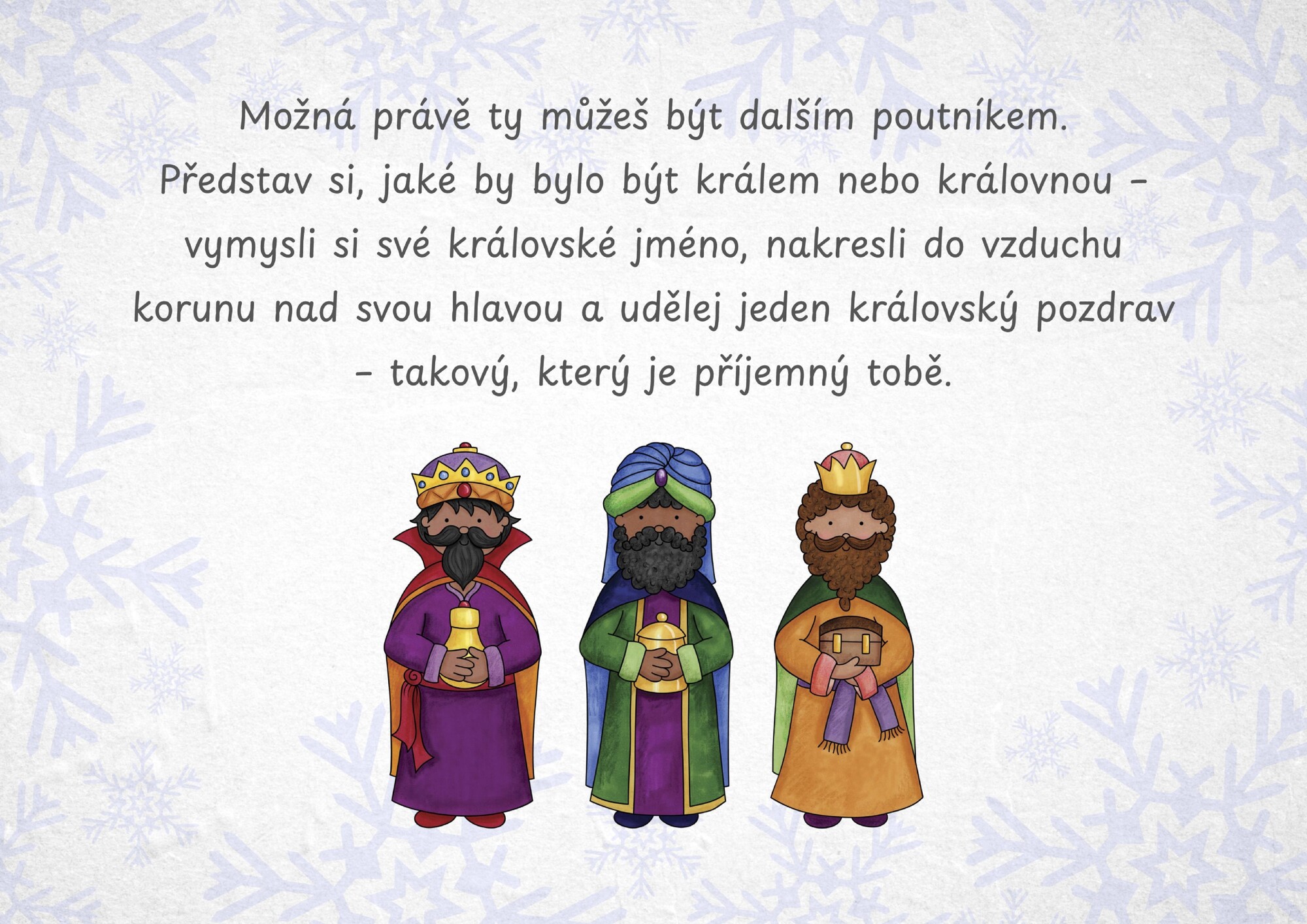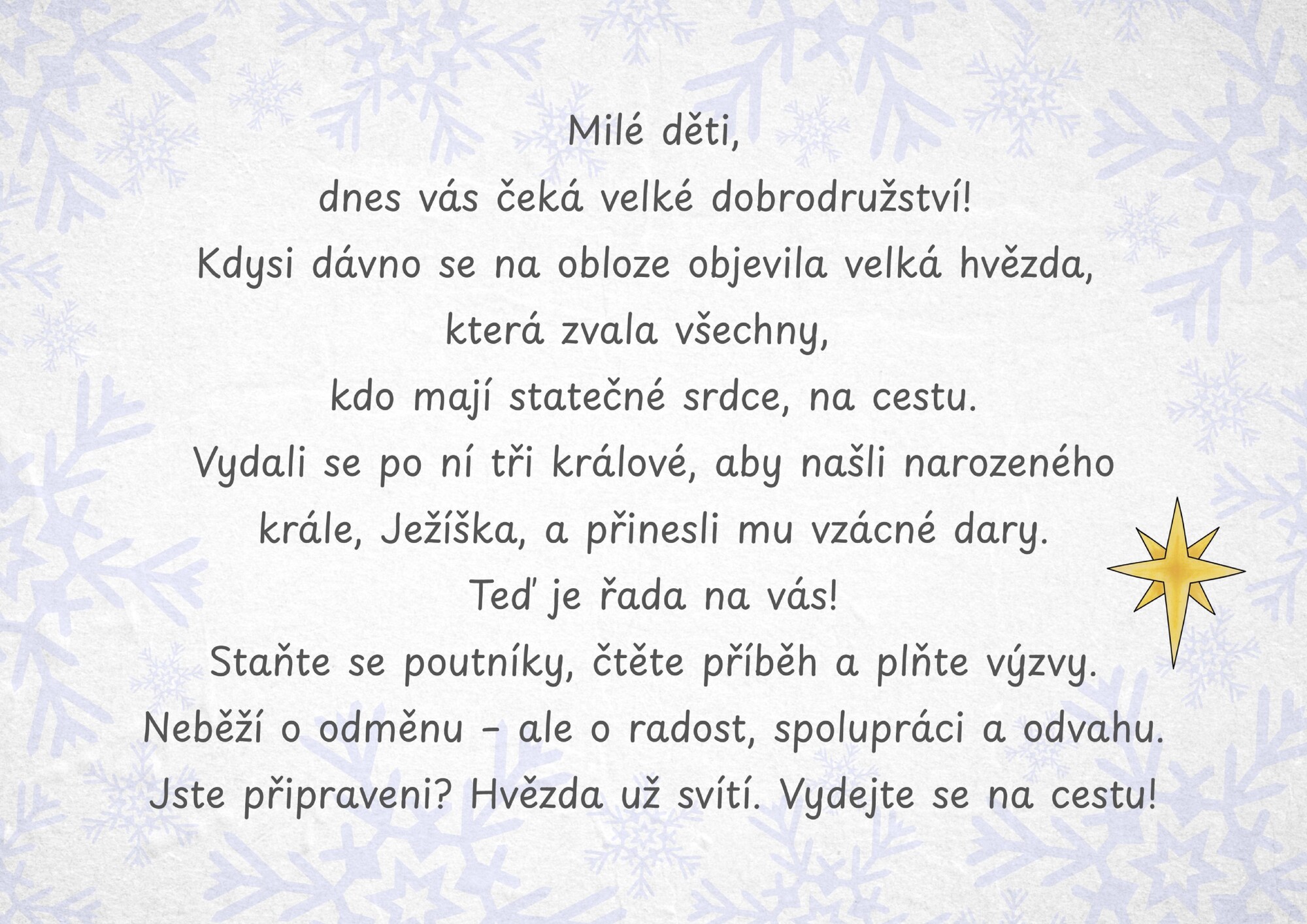 Příběhová stezka Putování Tří králů je připravený materiál pro venkovní i vnitřní použití, který stačí jen vytisknout a rozmístit. Děti postupují podle kartiček, které je provází příběhem Tří králů.