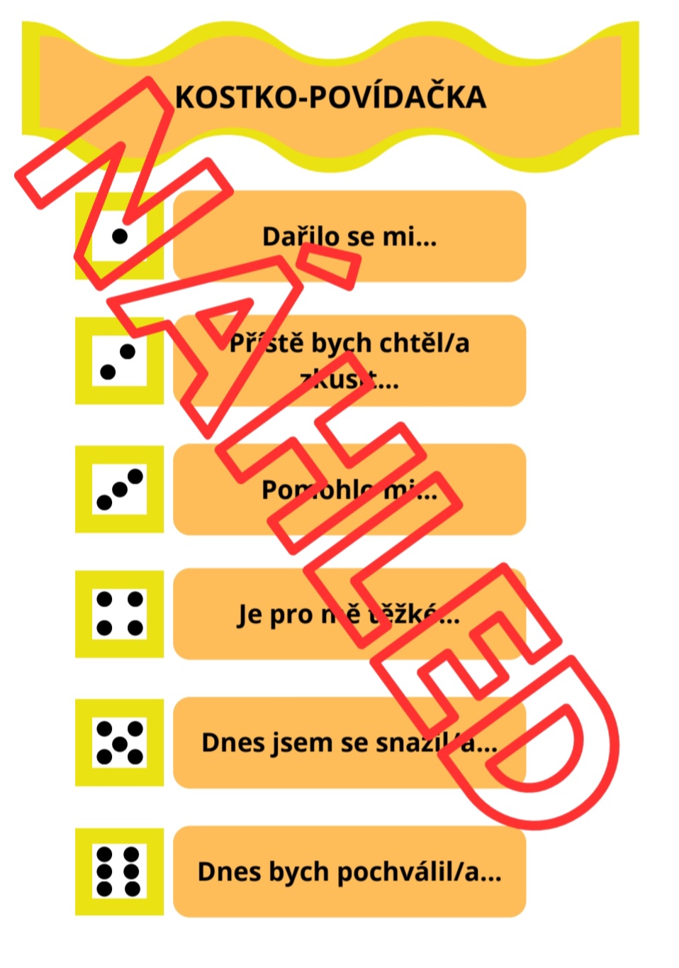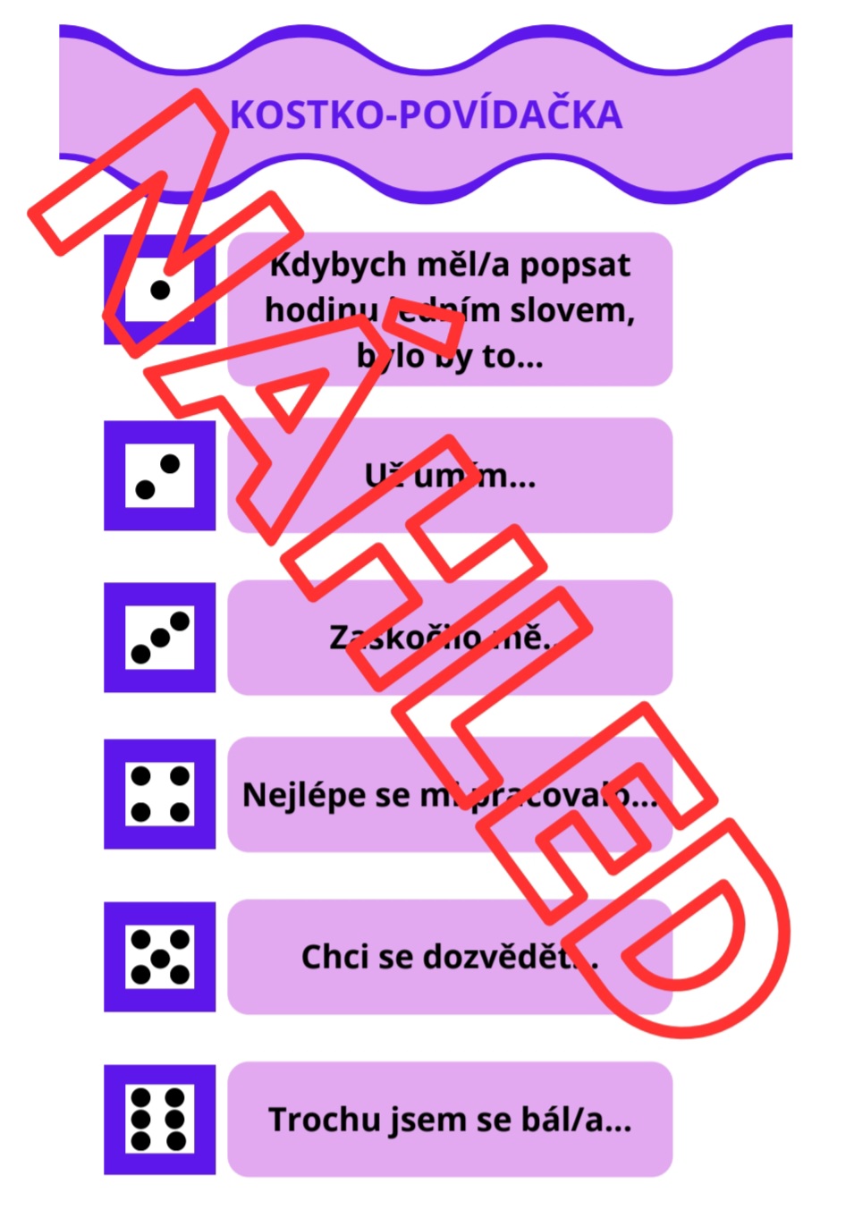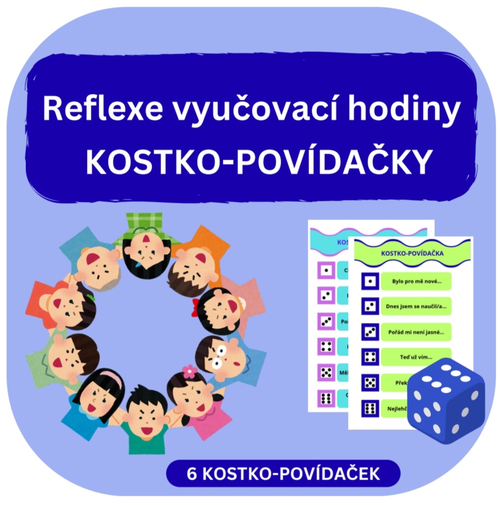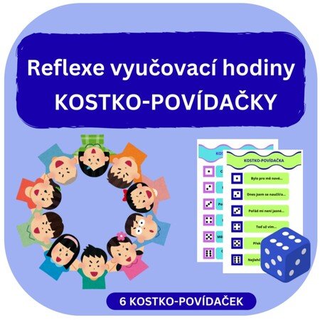 Hra KOSTKO-POVÍDAČKA slouží k reflexi vyučovací hodiny. Soubor obsahuje 6 kostko-povídaček. Hru můžete hrát s celou třídou najednou, ve skupinách či ve dvojicích. Každý žák postupně hodí kostkou a podle čísla, které mu padne, dokončí odpovídající nedokončenou větu vlastními slovy. Poté pokračuje další hráč.