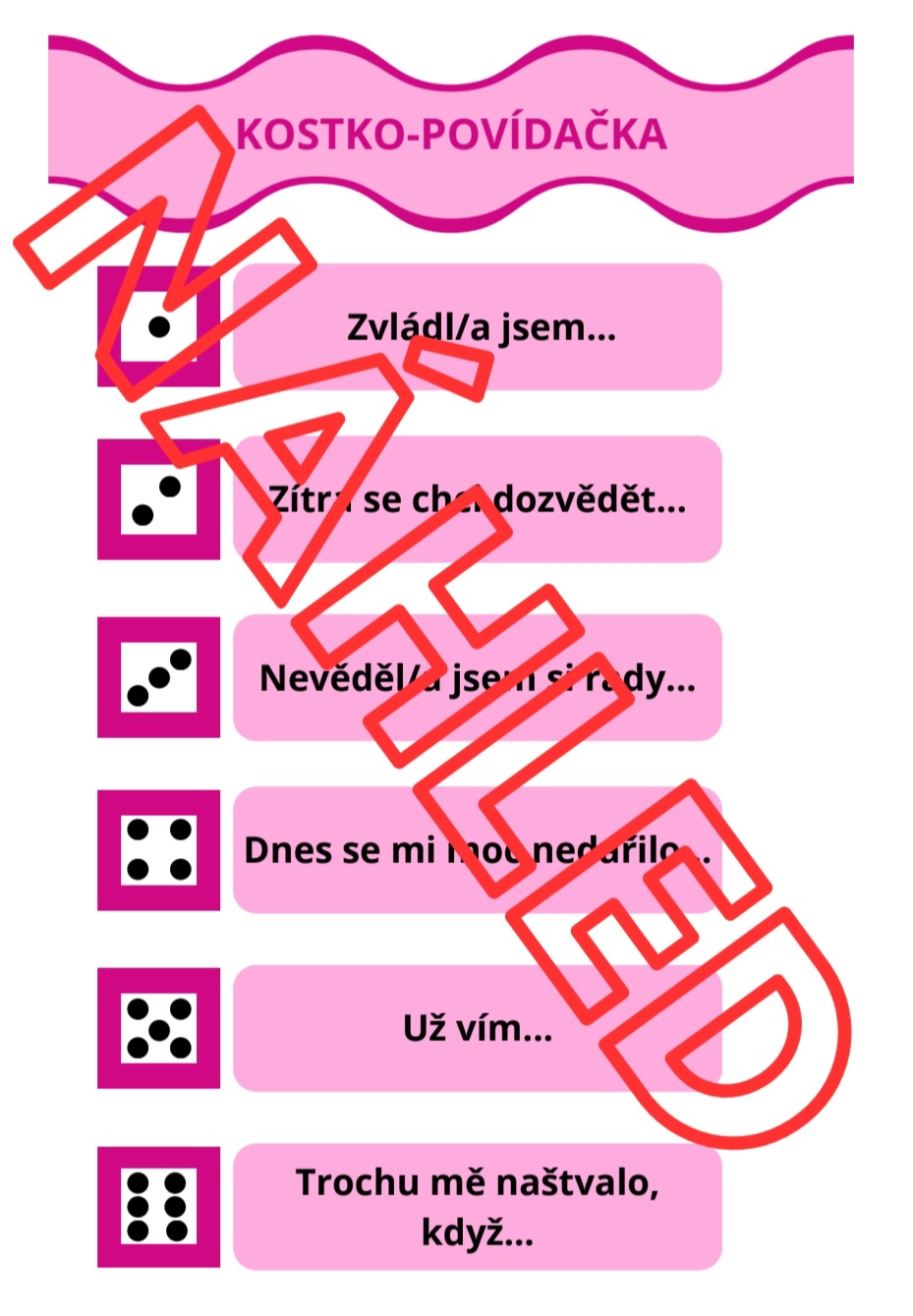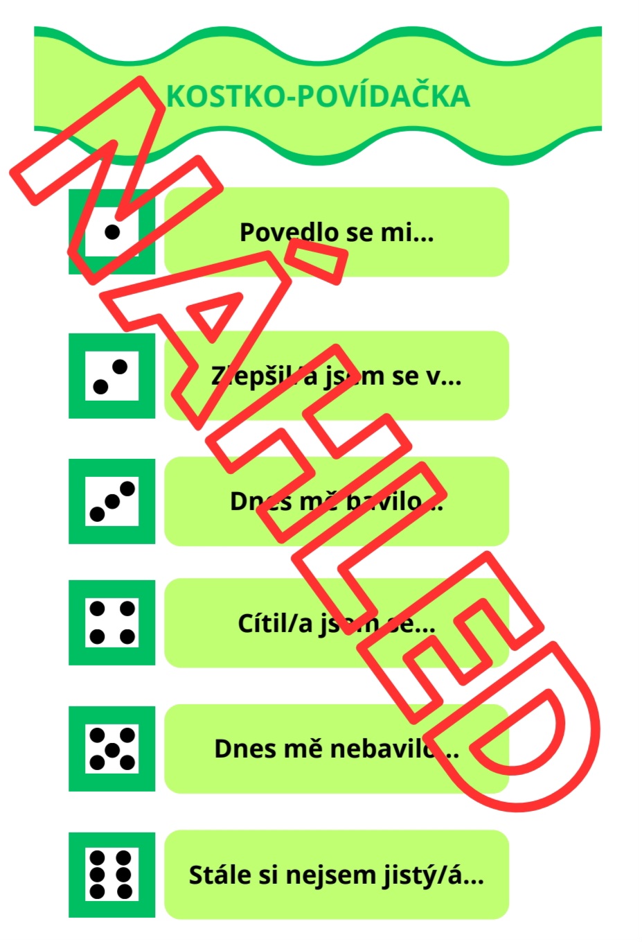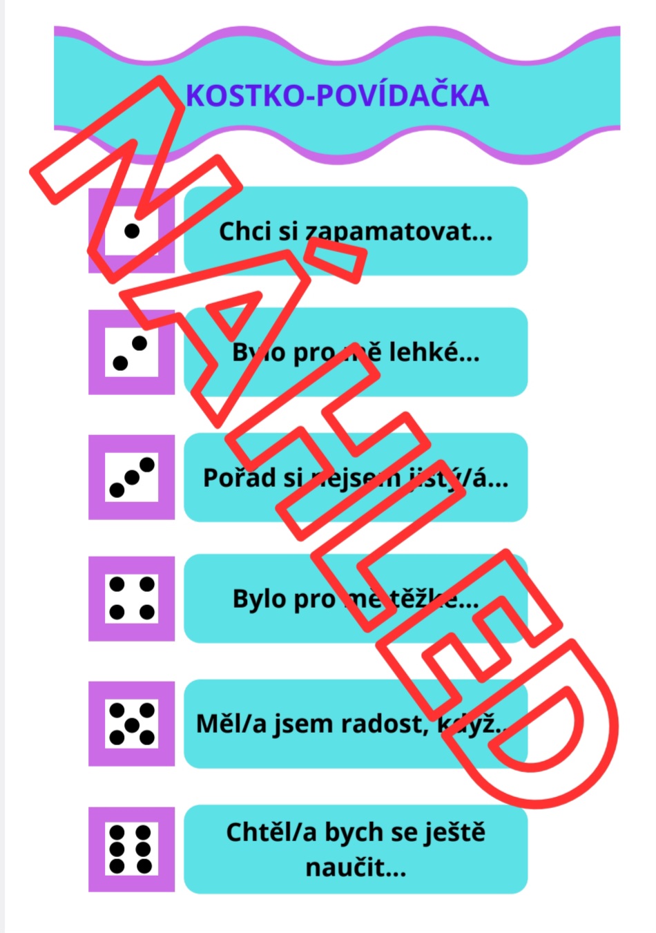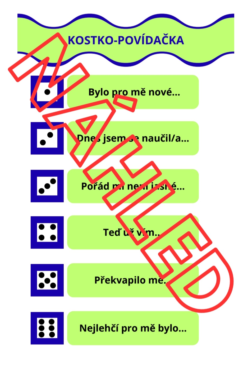 Hra KOSTKO-POVÍDAČKA slouží k reflexi vyučovací hodiny. Soubor obsahuje 6 kostko-povídaček. Hru můžete hrát s celou třídou najednou, ve skupinách či ve dvojicích. Každý žák postupně hodí kostkou a podle čísla, které mu padne, dokončí odpovídající nedokončenou větu vlastními slovy. Poté pokračuje další hráč.