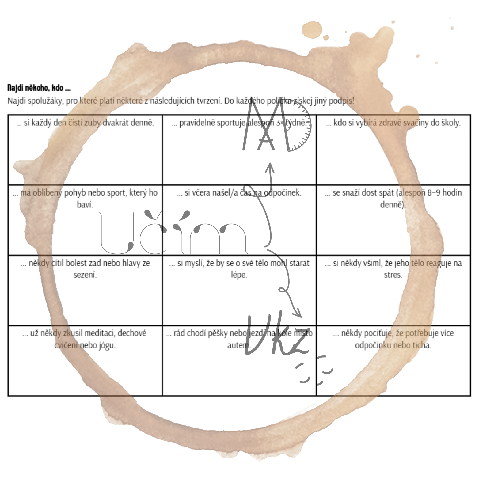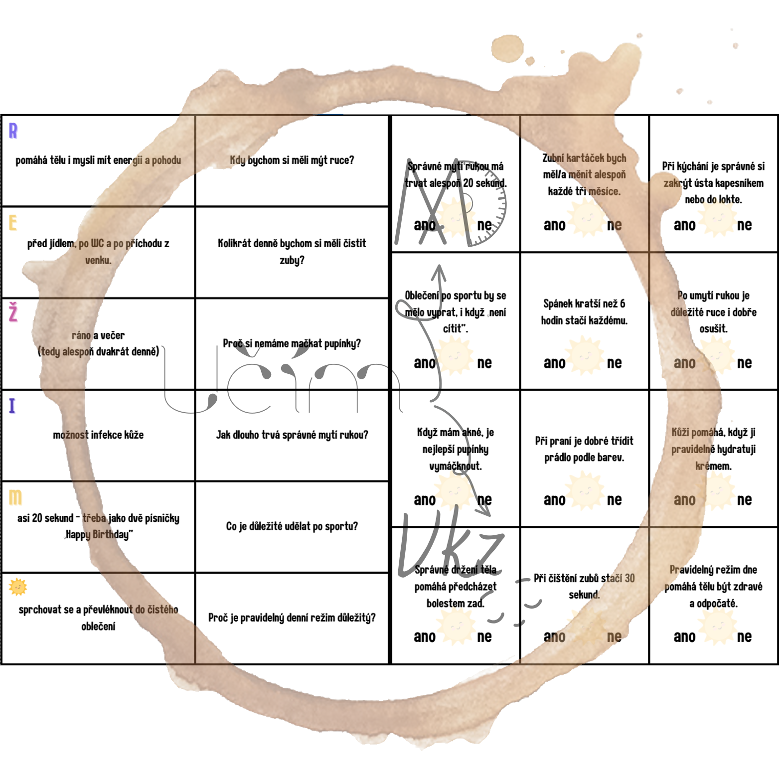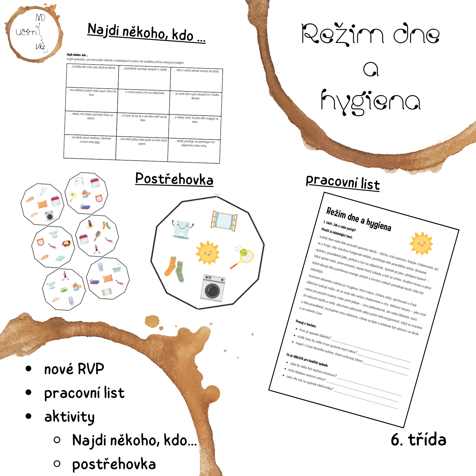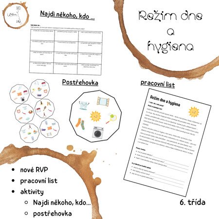 Materiál Režim dne a hygiena obsahuje pracovní list (a jeho řešení), aktivitu Najdi někoho, kdo ..., domino, ANO/NE karty a postřehovku.