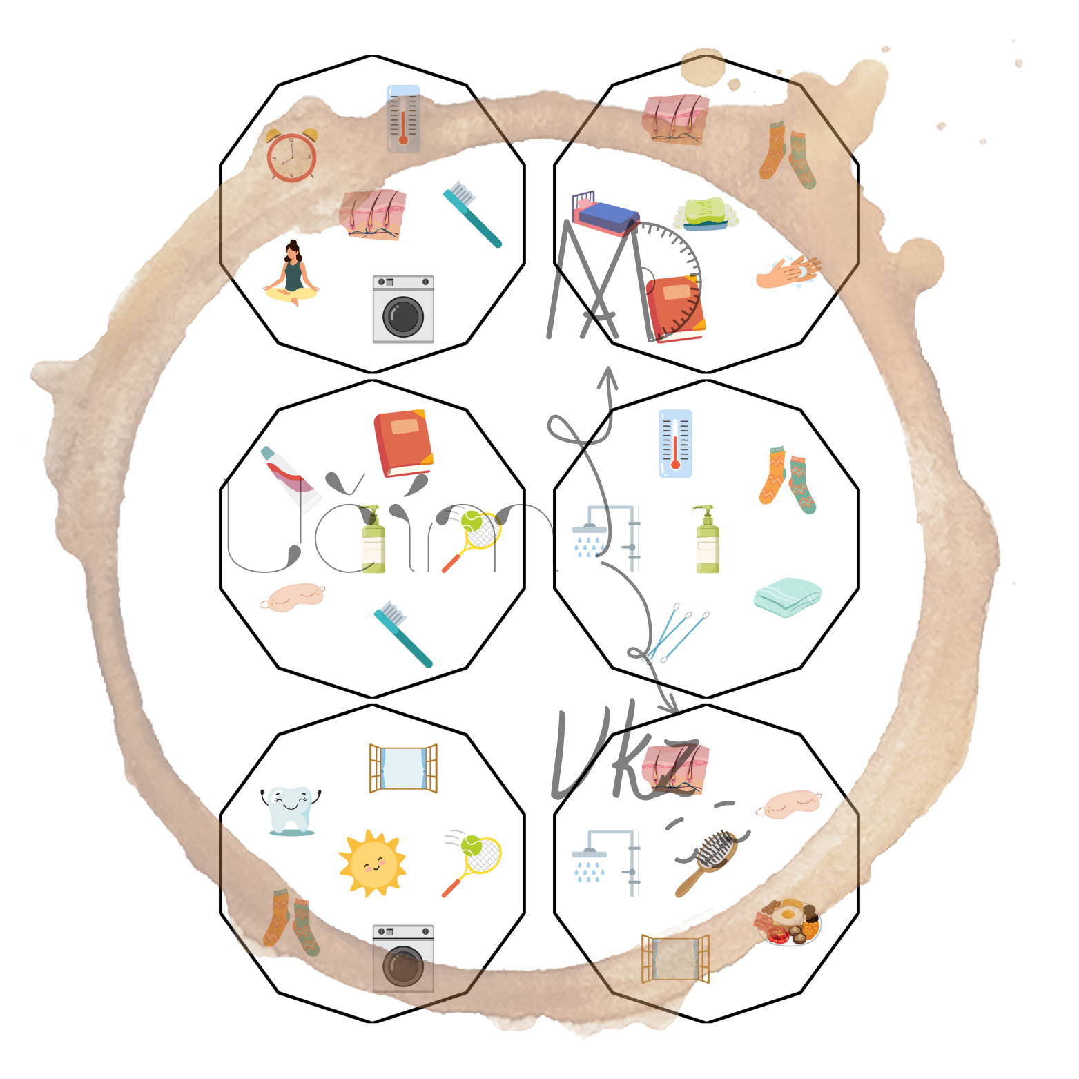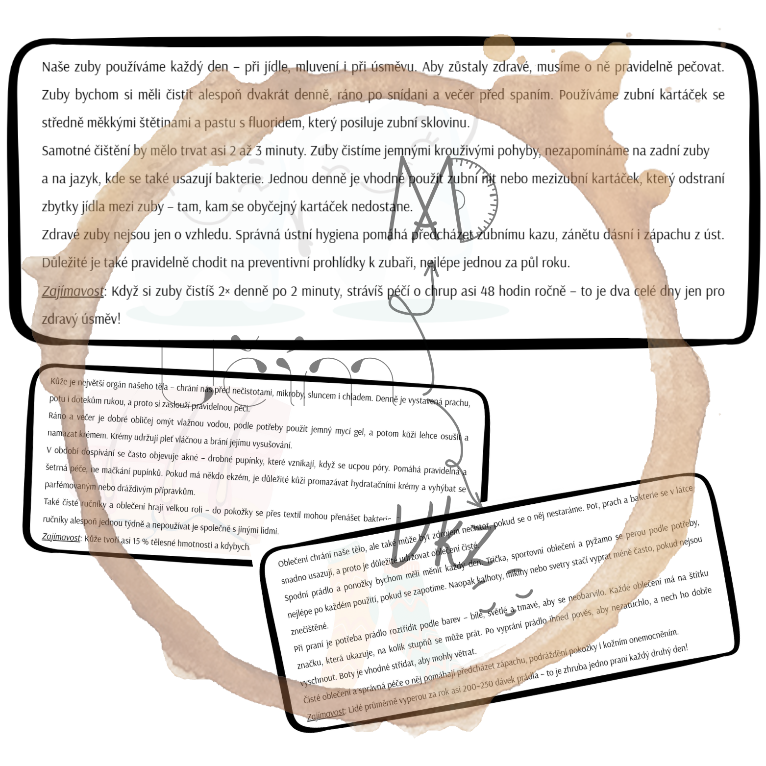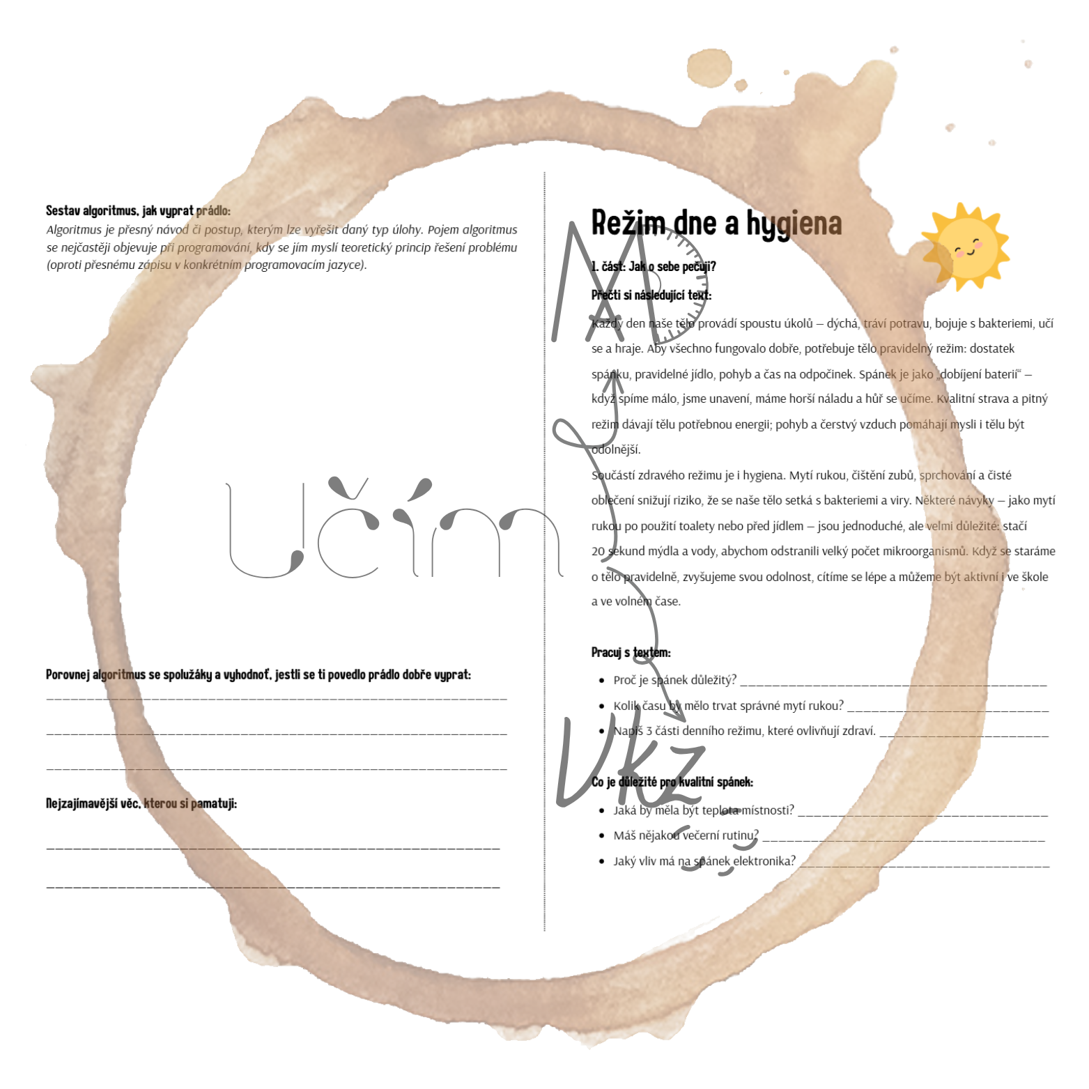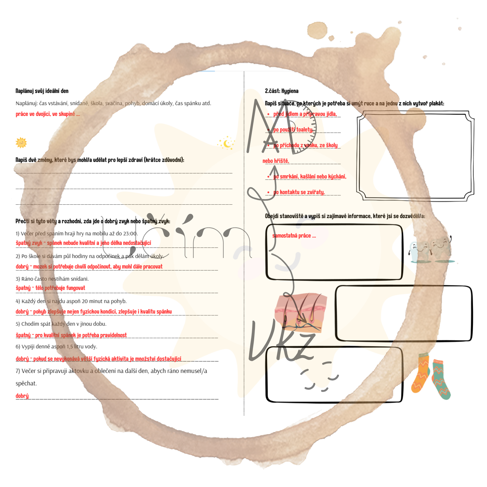 Materiál Režim dne a hygiena obsahuje pracovní list (a jeho řešení), aktivitu Najdi někoho, kdo ..., domino, ANO/NE karty a postřehovku.