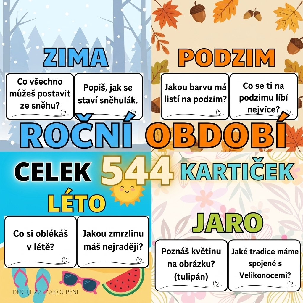 Každé období má své kouzlo a s našimi kartičkami ho děti objeví naplno. Pomozte jim vyprávět o jejich zážitcích, naučte je poznávat tradice a procvičte s nimi jazýčky i tělíčka.