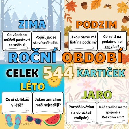 Sada ROČNÍ OBDOBÍ je nejucelenější kolekcí úkolů, kterou využijete ráno v kruhu v MŠ, při deštivých odpolednech doma nebo jako rychlou aktivitu ve škole.