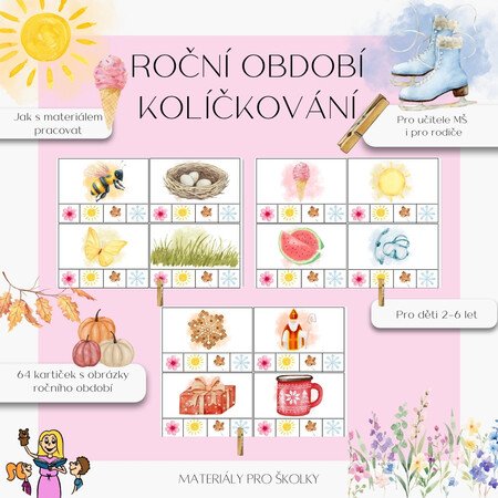 Sada obsahuje 64 kartiček s obrázky, které děti přiřazují pomocí kolíčku ke správnému ročnímu období.