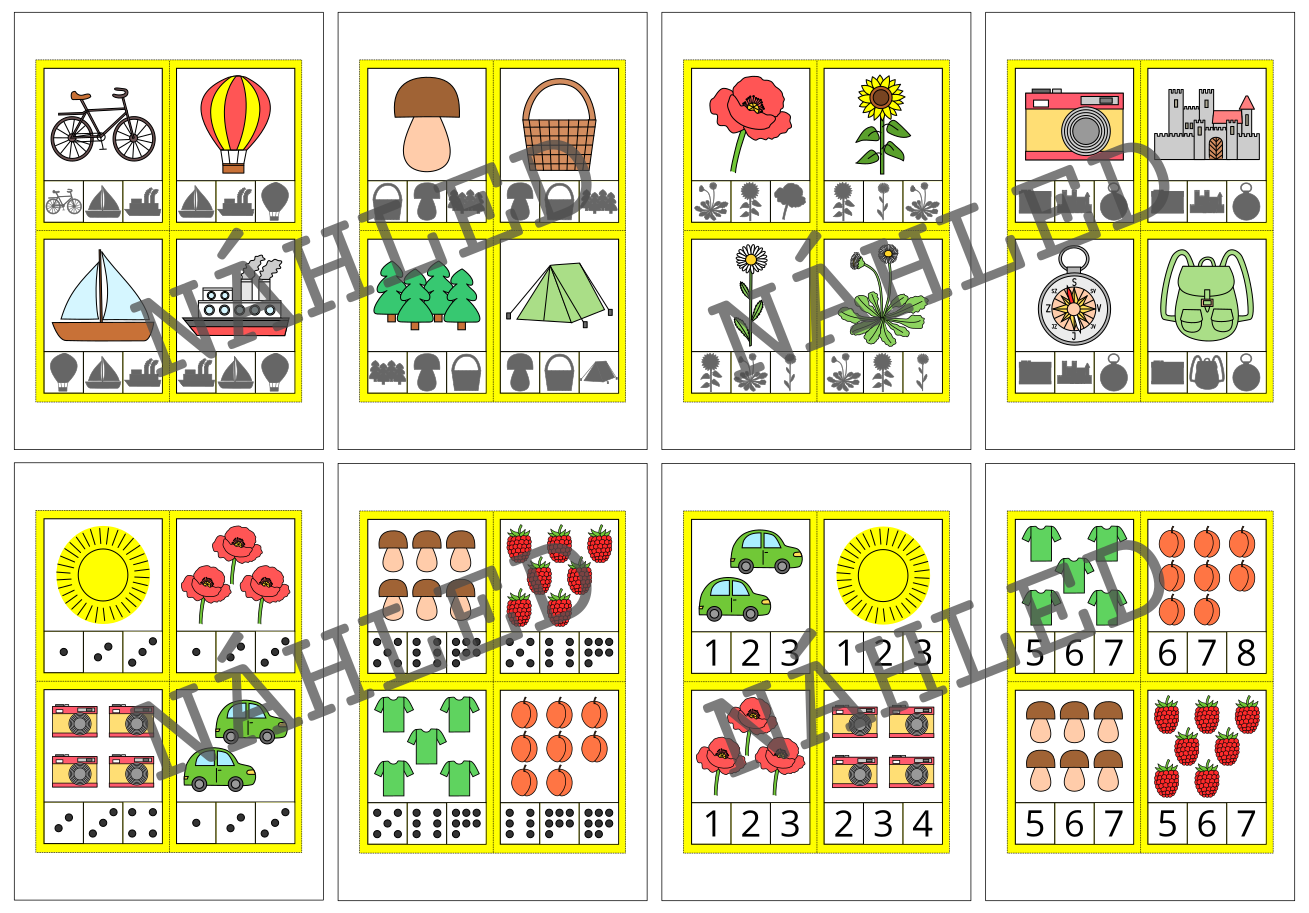 Děti označují kolíčkem stejný obrázek, správný stín, směr, počet puntíků nebo číslo.