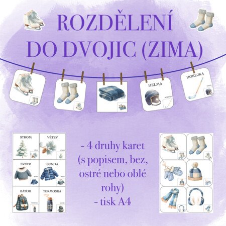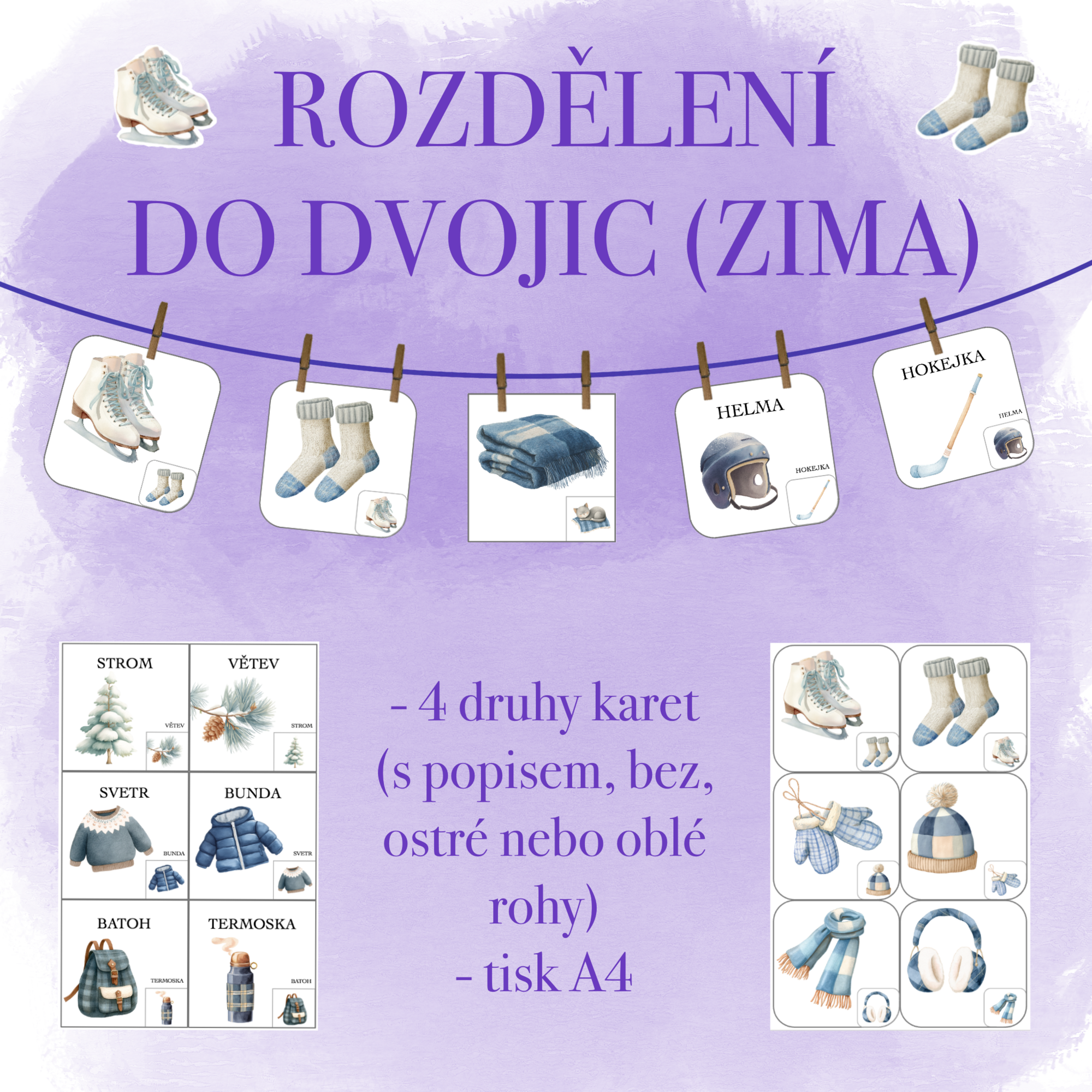 Tento soubor obsahuje karty se zimní tematikou na rozdělování dětí do dvojic při různých aktivitách (v případě lichého počtu dětí na konci najdete jednu trojici karet). Děti dostanou karty a následně k sobě hledají svou dvojici.