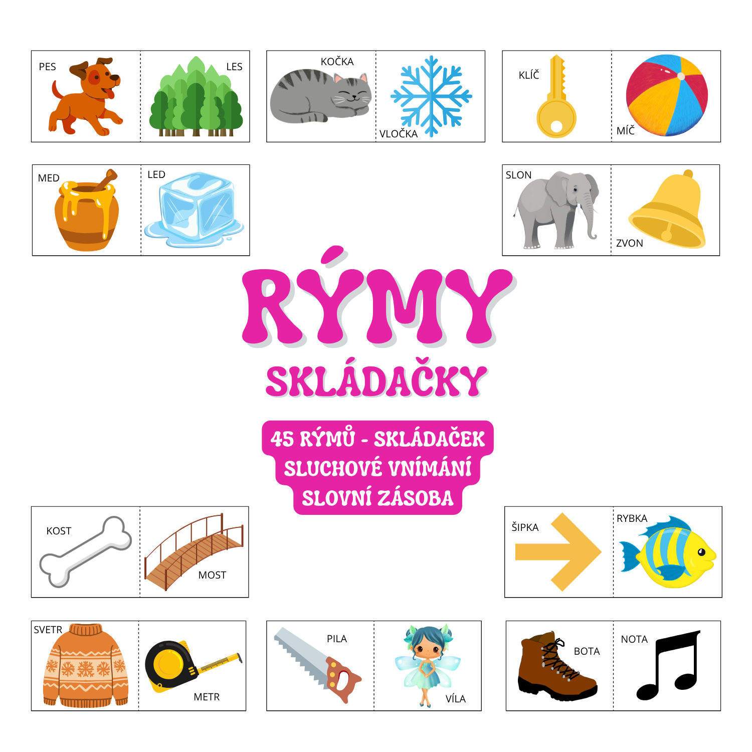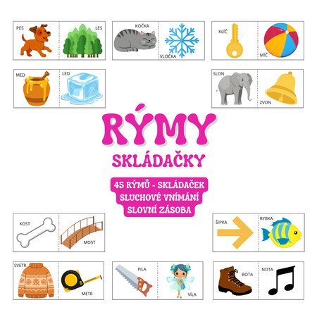 Soubor "RÝMY - skládačky" obsahuje 45 dvoudílných skládaček / rýmů + průvodní list s popisem, jak s materiálem pracovat.