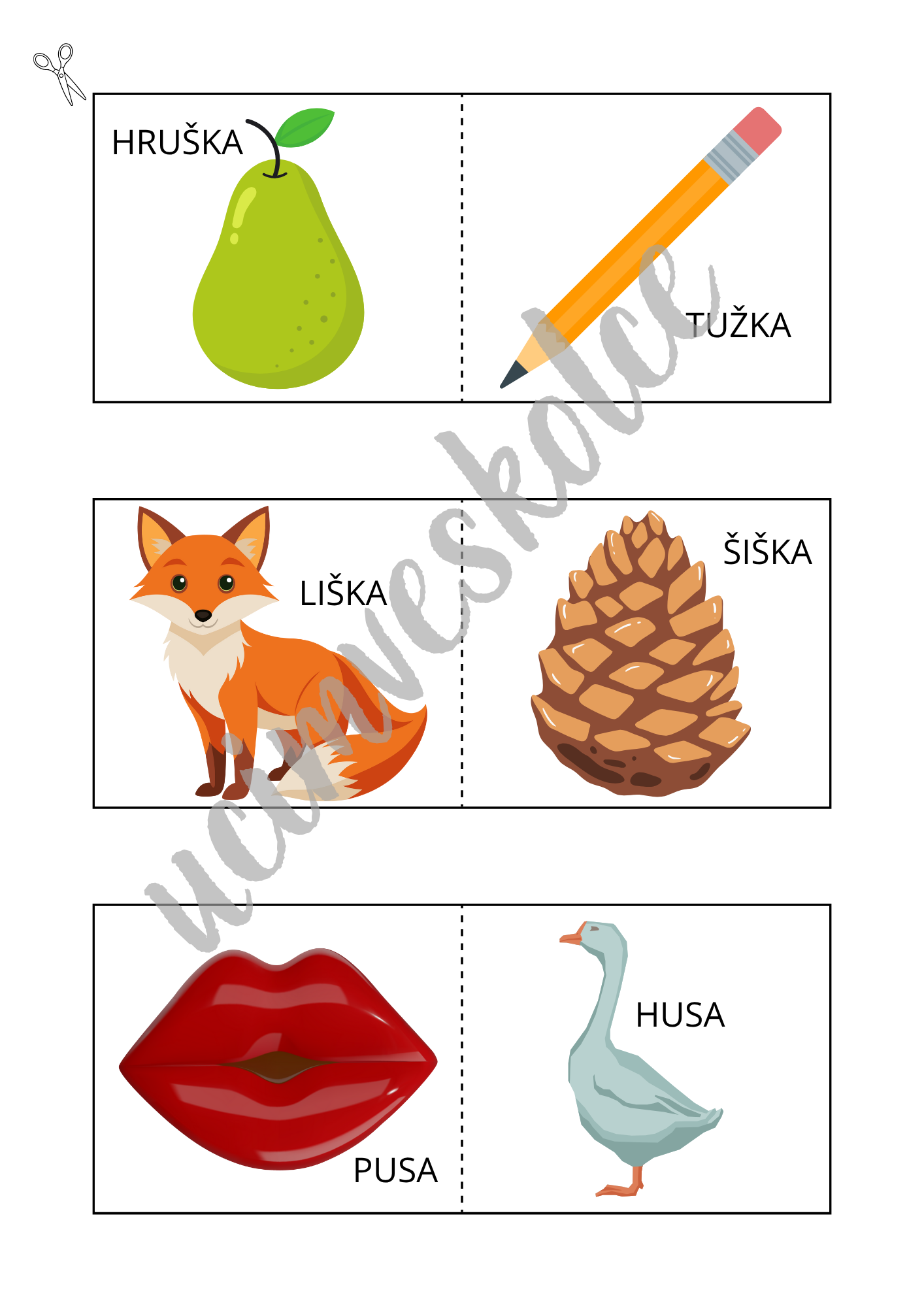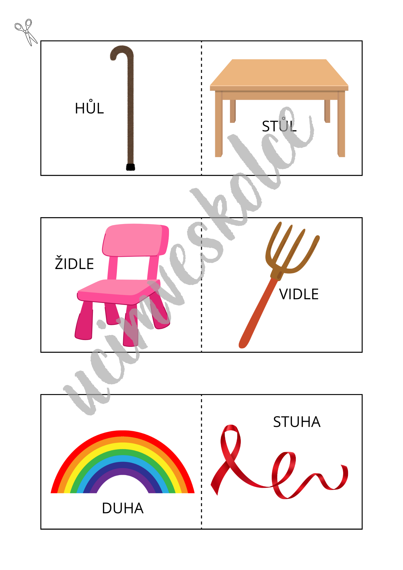Děti mají za úkol najít a přiložit k sobě vždy 2 kartičky, na nichž jsou zobrazeny předměty, jejichž názvy se rýmují.