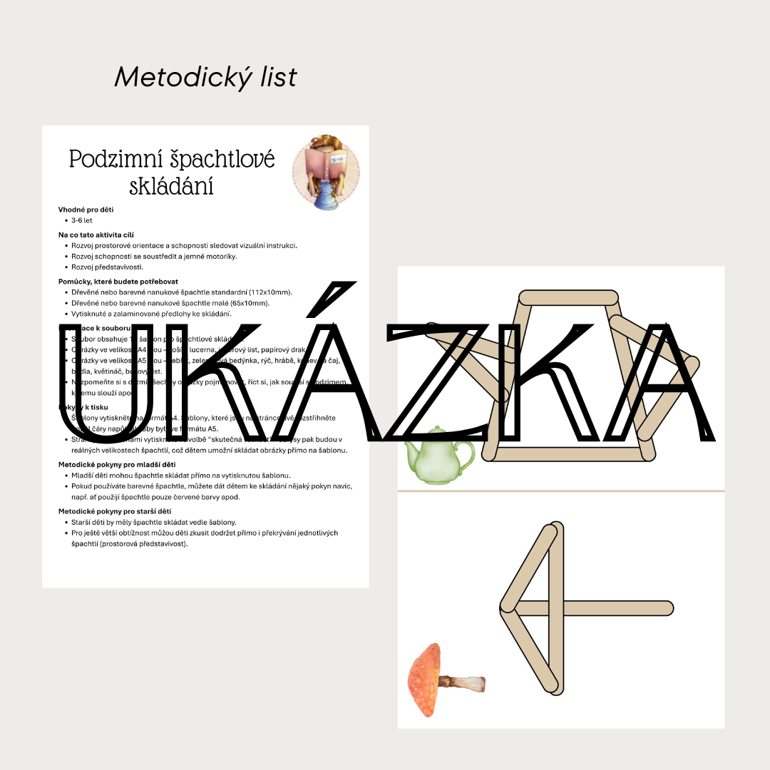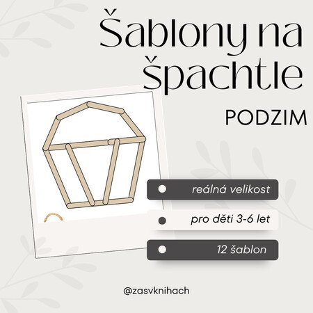 Soubor obsahuje 12 šablon pro špachtlové skládání v podzimním duchu. Šablony jsou tvořeny v reálné velikosti na malé i velké nanukové špachtle. Obrázky ve velikosti A4 (košík, lucerna, javorový list, papírový drak) i A5 (žebřík, zeleninová bedýnka, rýč, hrábě, konev na čaj, bedla, květináč, bukový list).