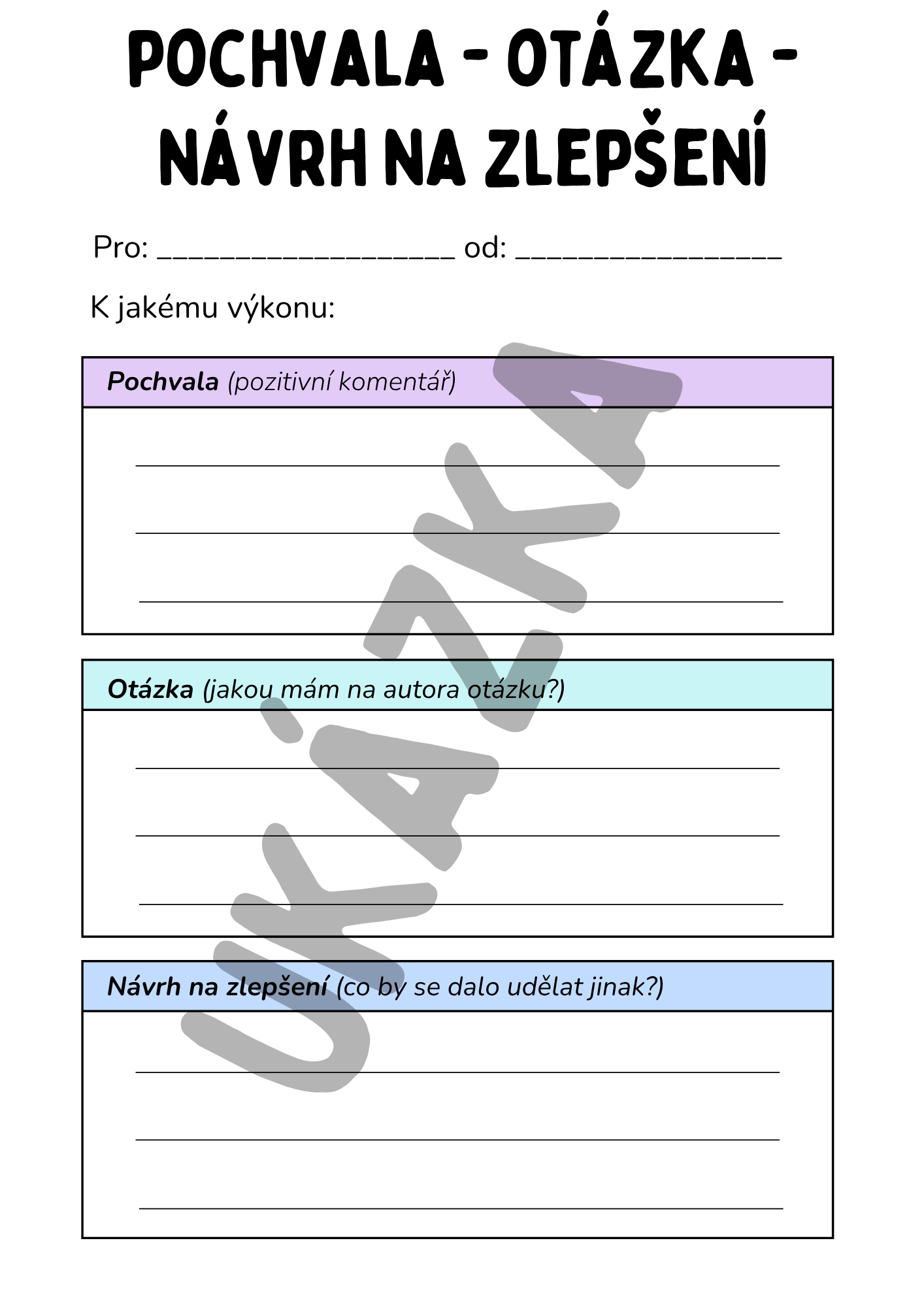Šablony poskytují žákům rámec a strukturu pro poskytování zpětné vazby (např. Kde přesně má být pochvala a kde návrh na zlepšení?).
