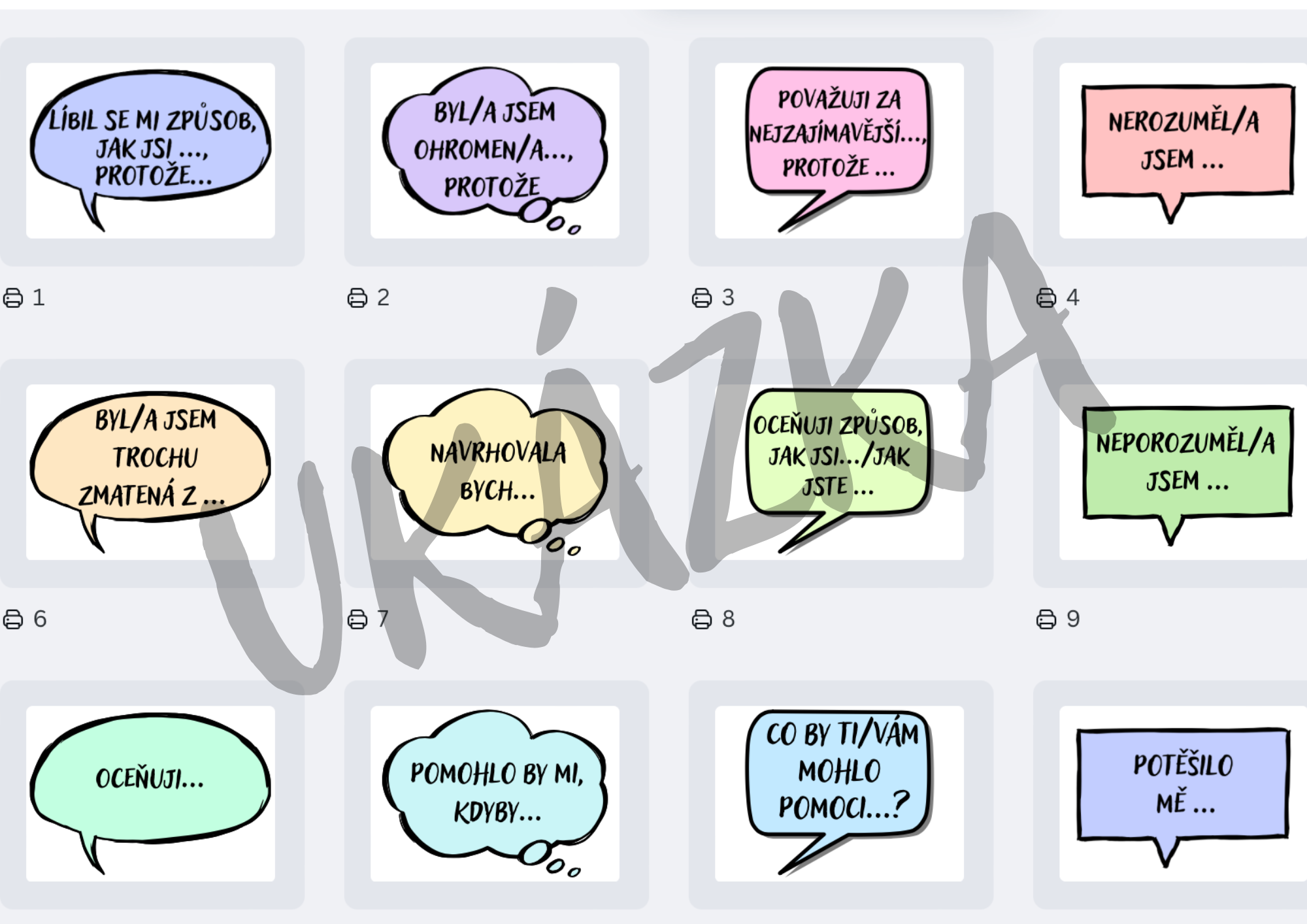 Nedokončené věty (obláčky) slouží jako konkrétní jazyková podpora pro vyplnění tohoto rámce. Pomáhají žákům formulovat své myšlenky do konkrétních a laskavých vět, které pak snadno dosadí do vybrané šablony.
