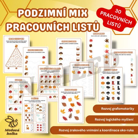 Soubor pracovních listů je zaměřen na rozvoj grafomotoriky, koordinace oko-ruka, rozvoj pozornosti a zrakového vnímání a také rozvoj logického myšlení a paměti.