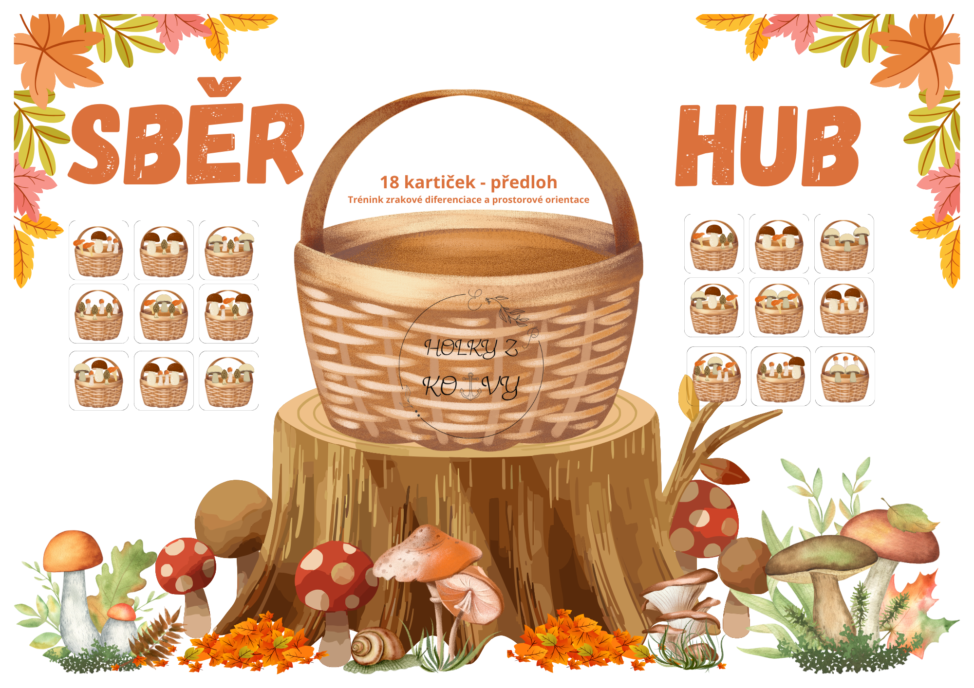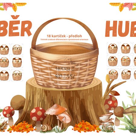 Soubor obsahuje 18 kartiček košíků plných hub, které slouží jako předlohy pro skládání. Zaměřeno na trénink zrakové diferenciace a prostorové orientace.