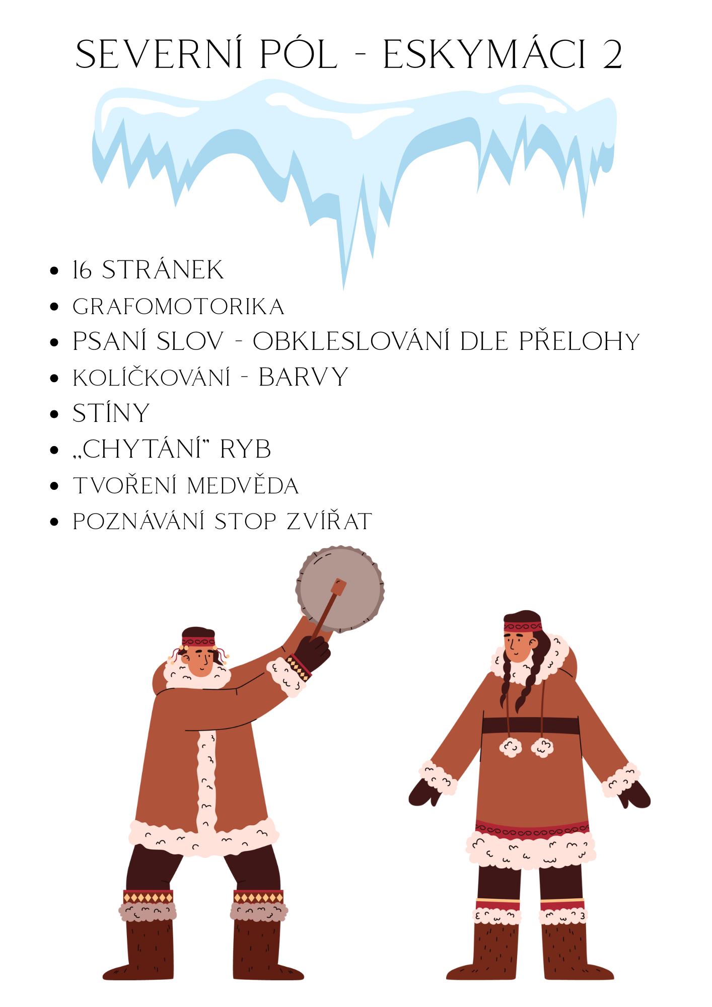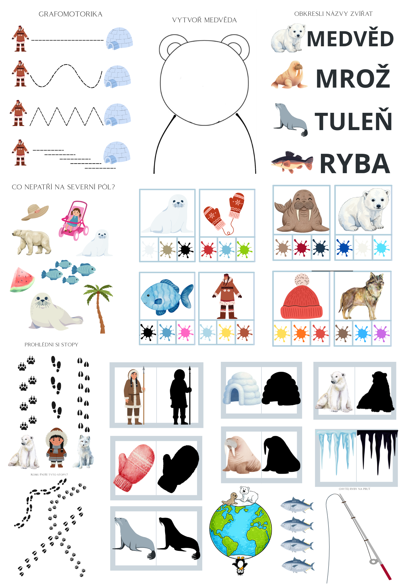 Tento soubor obsahuje druhou část sady pracovních listů zaměřených na rozvoj jemné motoriky, zrakového vnímání a logického uvažování. Najdete zde grafomotorický list, kolíčkování na barvy, vyhledávání stínů, úlohy na logické myšlení a další aktivity vhodné pro děti. Materiály jsou tematicky laděny k tématu Severního pólu a Eskymáků a podporují učení formou hry.