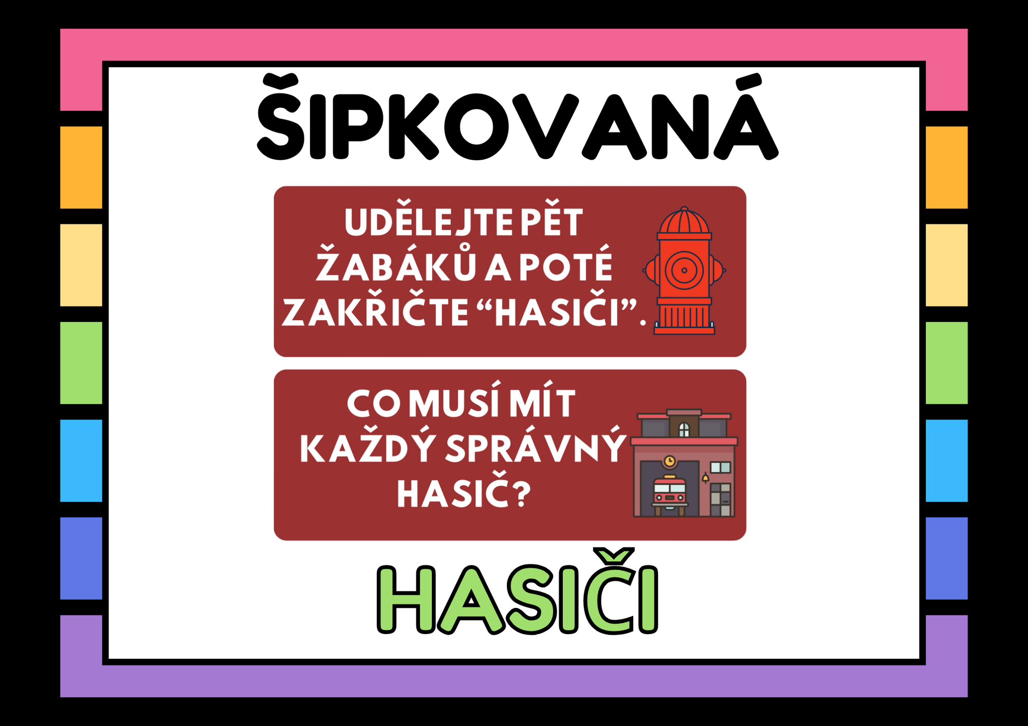 Šipkovaná na téma hasiči. Soubor obsahuje 20 kartiček s úkoly, které jsou zaměřeny na různé oblasti.