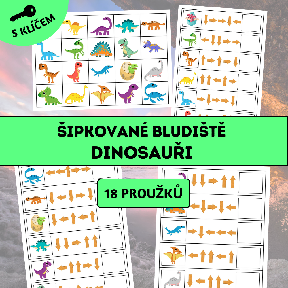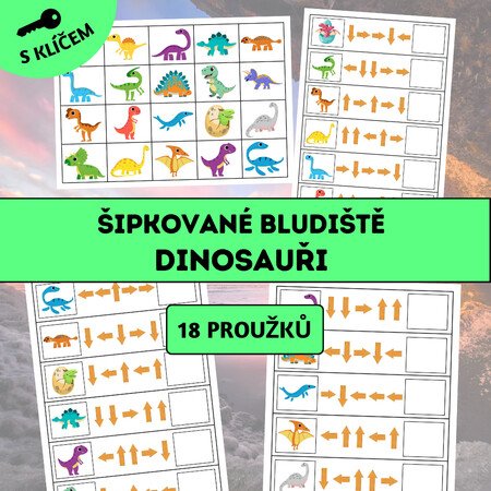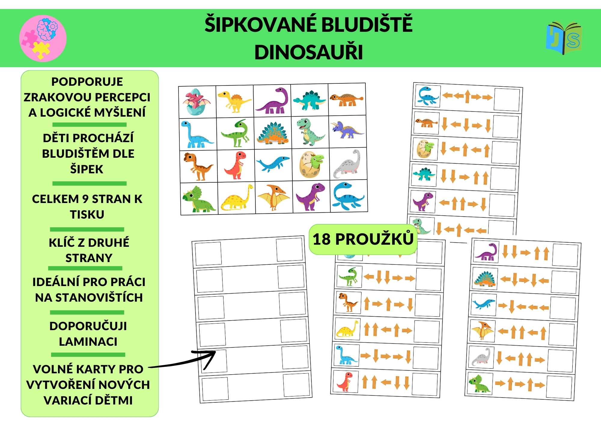 Dinosauří šipkované bludiště je hravý vzdělávací materiál zaměřený na rozvoj zrakové percepce, prostorové orientace a logického myšlení. Děti postupují bludištěm podle směrových šipek (vlevo, vpravo, nahoru, dolů) a sledují cestu od startovního bodu až k cílovému dinosaurovi.