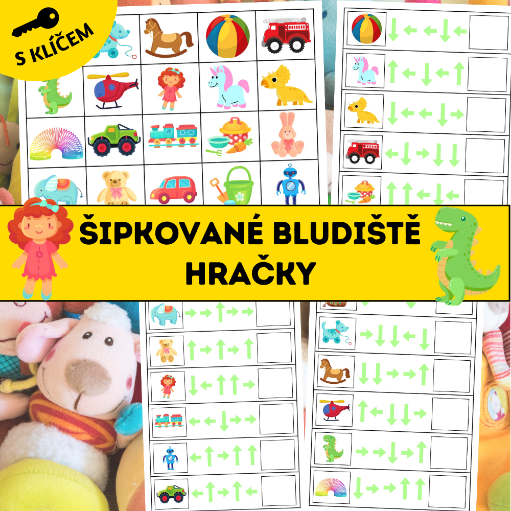 Šipkované bludiště: hračky je aktivita pro rozvoj zrakové percepce, prostorové orientace a logického myšlení. Děti sledují směrové šipky, plánují postup a určují správný cíl bludiště. Aktivita podporuje soustředění, práci podle symbolů a jemnou motoriku.