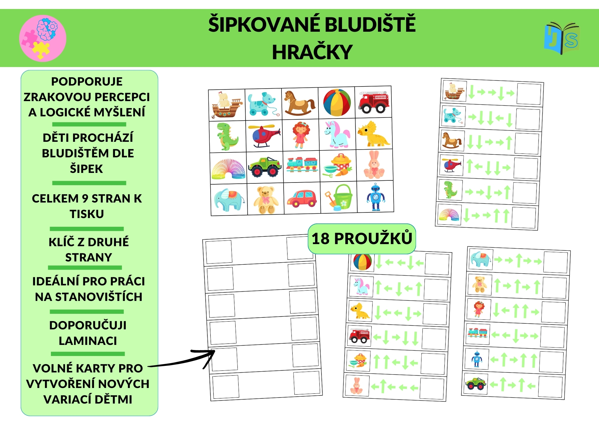 Materiál obsahuje bludiště s hračkami, 18 proužků se šipkami, karty k přikládání a klíč na druhé straně karet. Lze jej využít pro individuální práci, dvojice, centra aktivit, stanoviště, ranní práci i tichou činnost. Součástí jsou též volné karty, díky kterým mohou děti vytvářet vlastní varianty bludiště.
