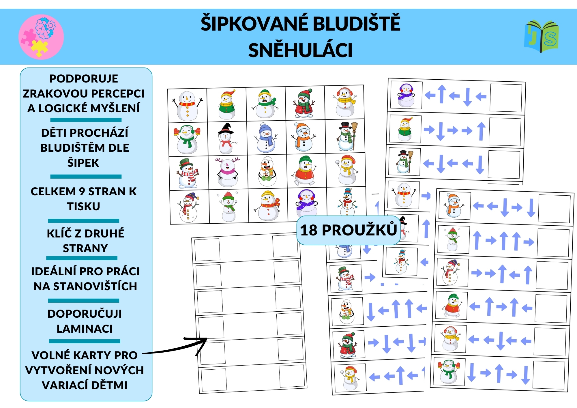 Soubor obsahuje bludiště se sněhuláky, 18 proužků se šipkami, karty k přikládání i volné karty pro vytváření vlastních variant. Součástí je také klíč řešení na druhé straně. Materiál je určen k tisku (celkem 9 stran) a doporučuje se laminace pro opakované použití.