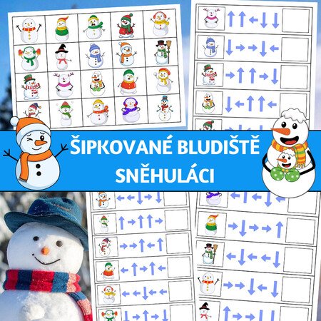 Šipkované bludiště – Sněhuláci je zábavná zimní aktivita, která rozvíjí zrakovou percepci, prostorovou orientaci a logické myšlení dětí. Děti sledují trasu v bludišti podle směrových šipek (nahoru, dolů, vlevo, vpravo) a na konci cesty přiřazují správnou kartu se sněhulákem.