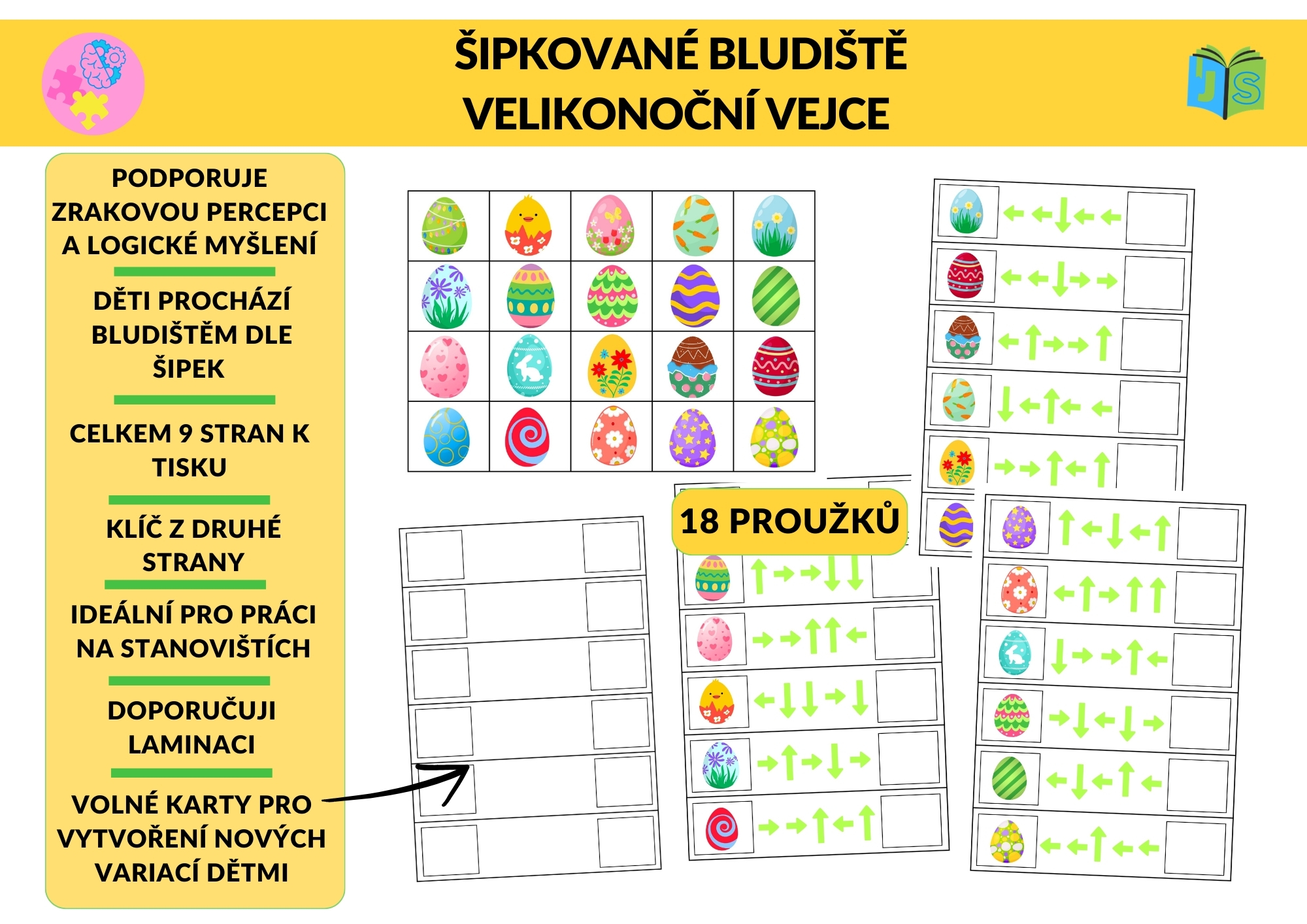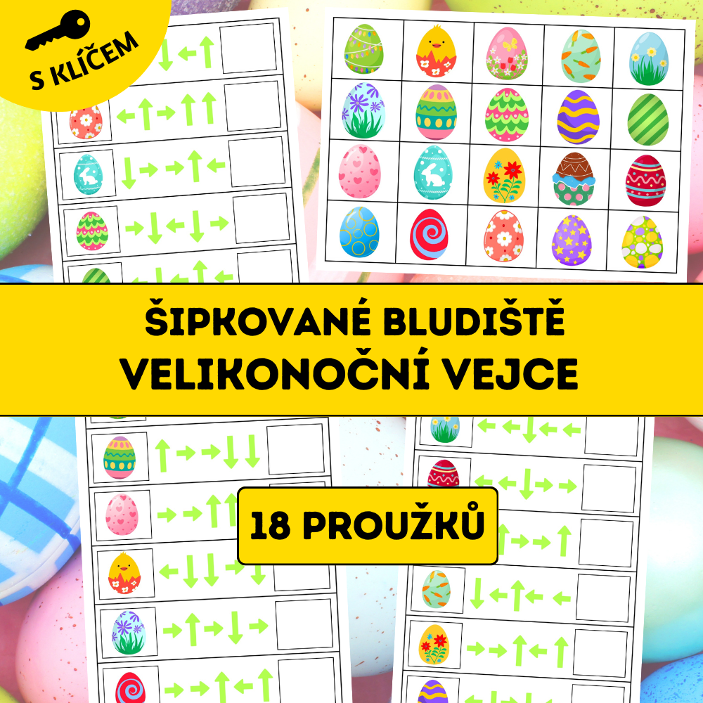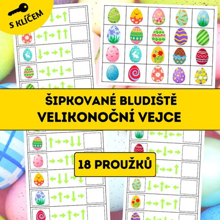 Velikonoční šipkované bludiště je hravý vzdělávací materiál zaměřený na rozvoj zrakové percepce, prostorové orientace a logického myšlení. Děti postupují bludištěm podle směrových šipek (vlevo, vpravo, nahoru, dolů) a sledují cestu až k cílovému velikonočnímu vajíčku.